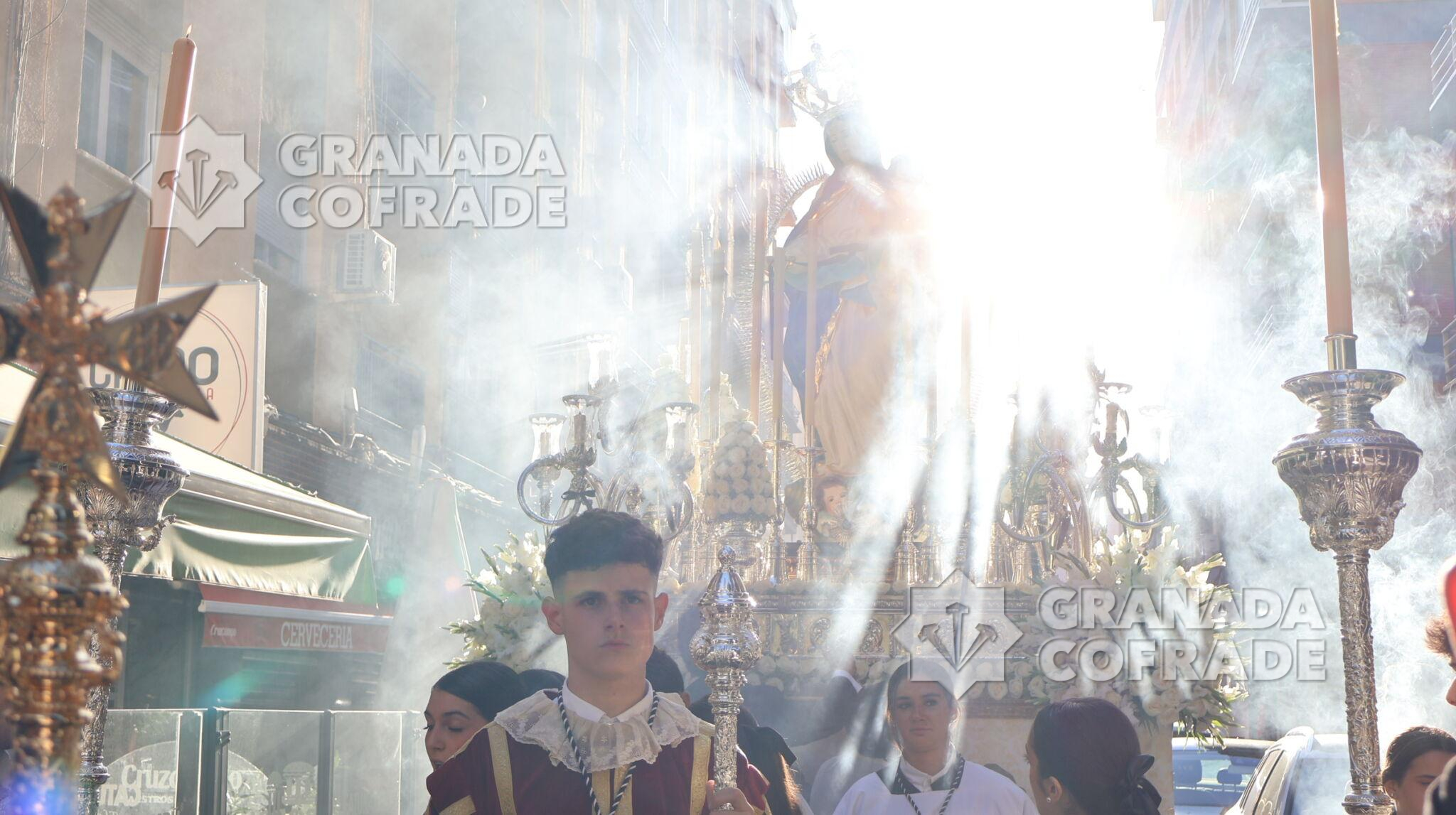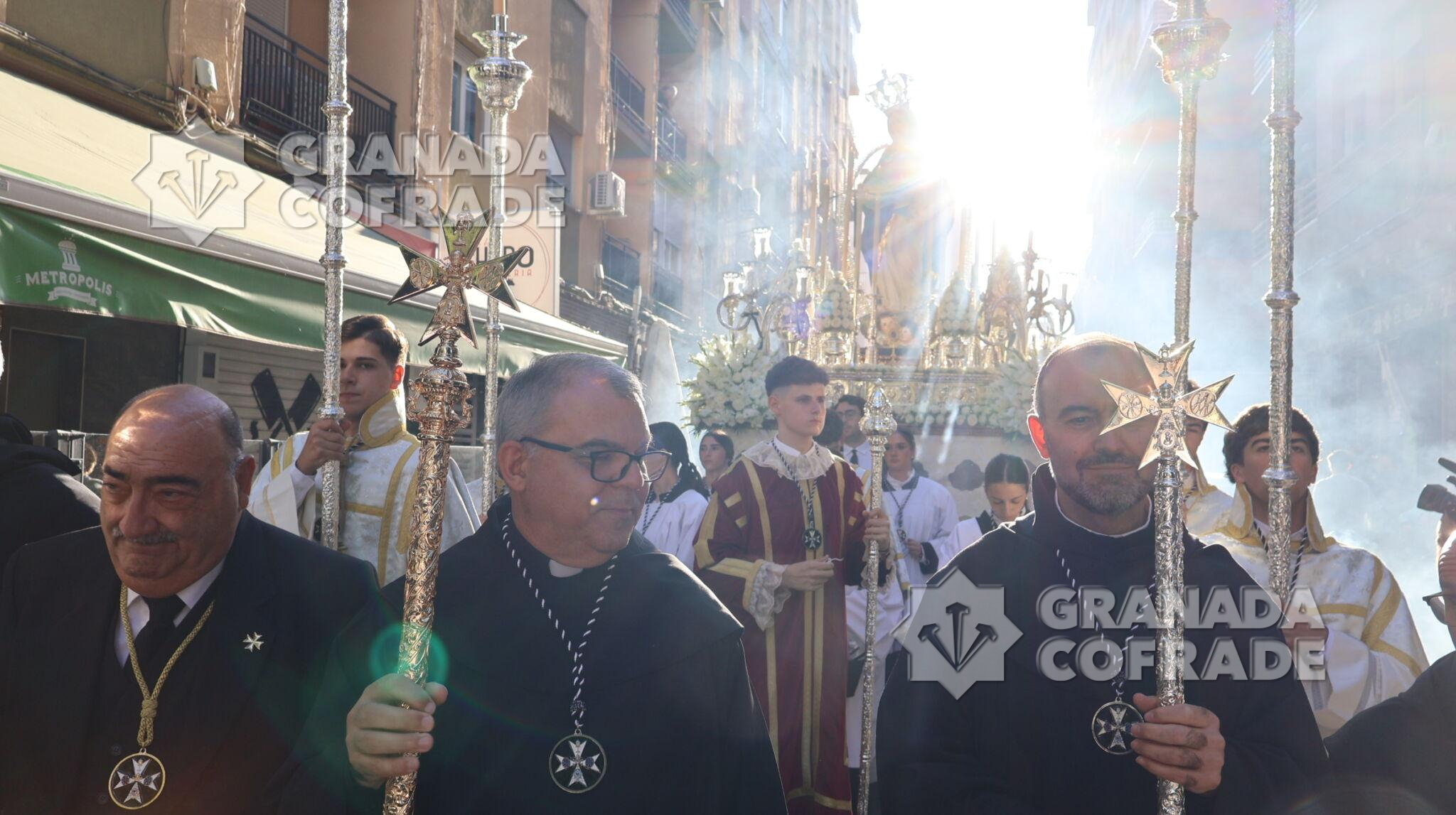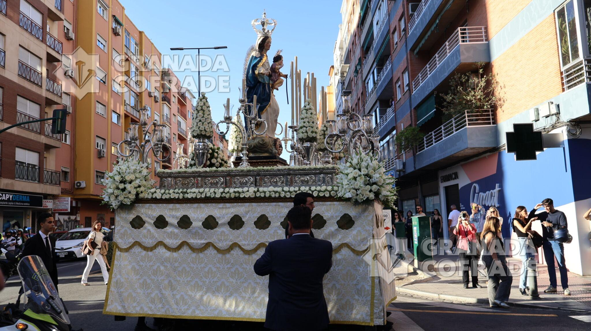 La procesión de Nuestra Señora de la Consolación y Correa de San Agustín, de la Archicofradía de su nombre, recorrió ayer las calles que separan el barrio de La Rosaleda del centro de la capital hasta llegar por Martínez de la Rosa y Gran Capitán hasta la parroquia de Santa María Magdalena para realizar en este lugar la estación de gloria de esta corporación letífica agustina.