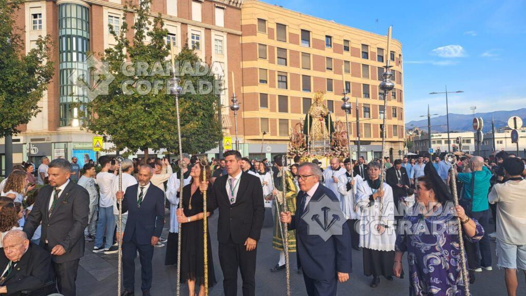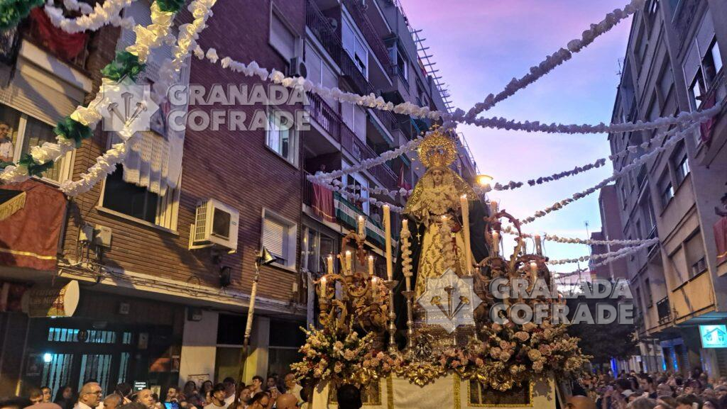 El cortejo estuvo formado por numerosos hermanos y vecinos del barrio, hasta un total de 25 parejas, y estuvo acompañado musicalmente por la Banda de los Ángeles. Durante su recorrido, la Virgen visitó la Casa de Hermandad de Santa María de la Alhambra y pasó por el entorno de la Estación de Ferrocarril antes de adentrarse en las calles de su barrio. Halcón, Gaviota, Faisán o Cisne fueron algunos de los puntos por los que discurrió la procesión antes de llegar a Tórtola, donde era esperada con especial devoción.
