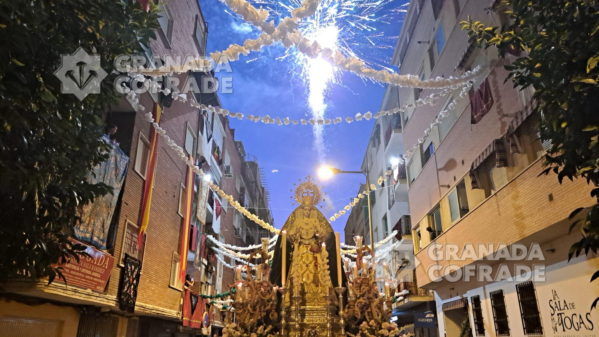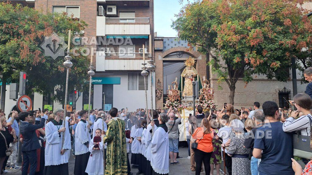 El cortejo estuvo formado por numerosos hermanos y vecinos del barrio, hasta un total de 25 parejas, y estuvo acompañado musicalmente por la Banda de los Ángeles. Durante su recorrido, la Virgen visitó la Casa de Hermandad de Santa María de la Alhambra y pasó por el entorno de la Estación de Ferrocarril antes de adentrarse en las calles de su barrio. Halcón, Gaviota, Faisán o Cisne fueron algunos de los puntos por los que discurrió la procesión antes de llegar a Tórtola, donde era esperada con especial devoción.