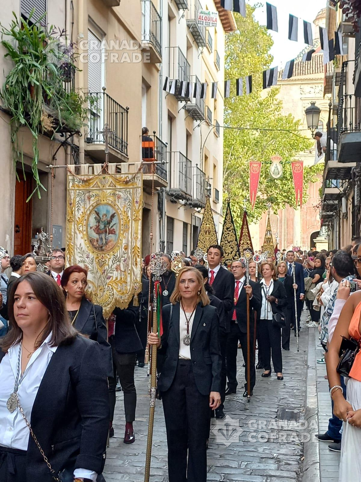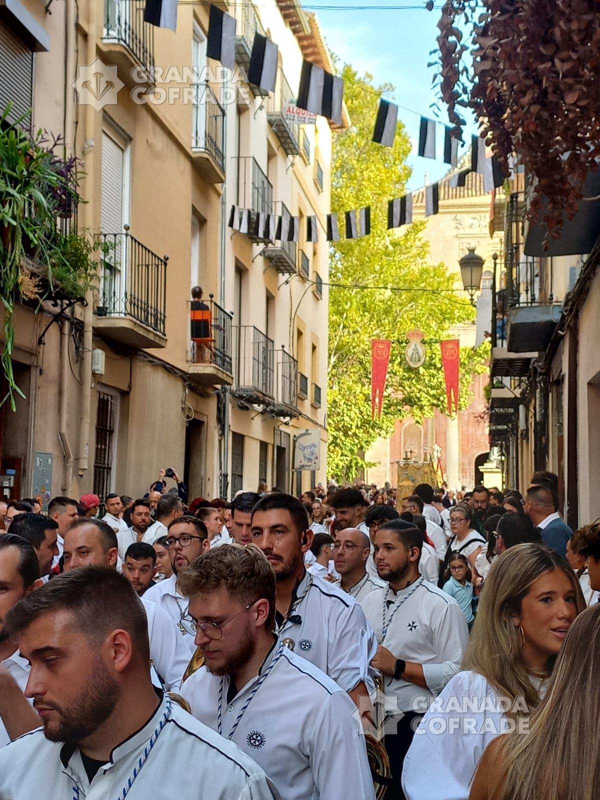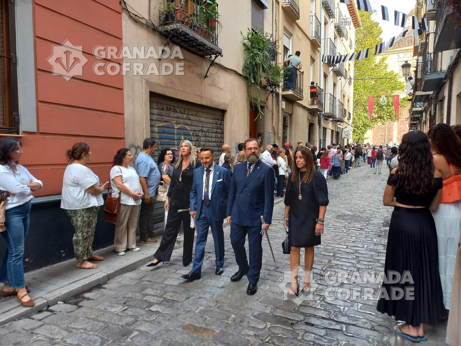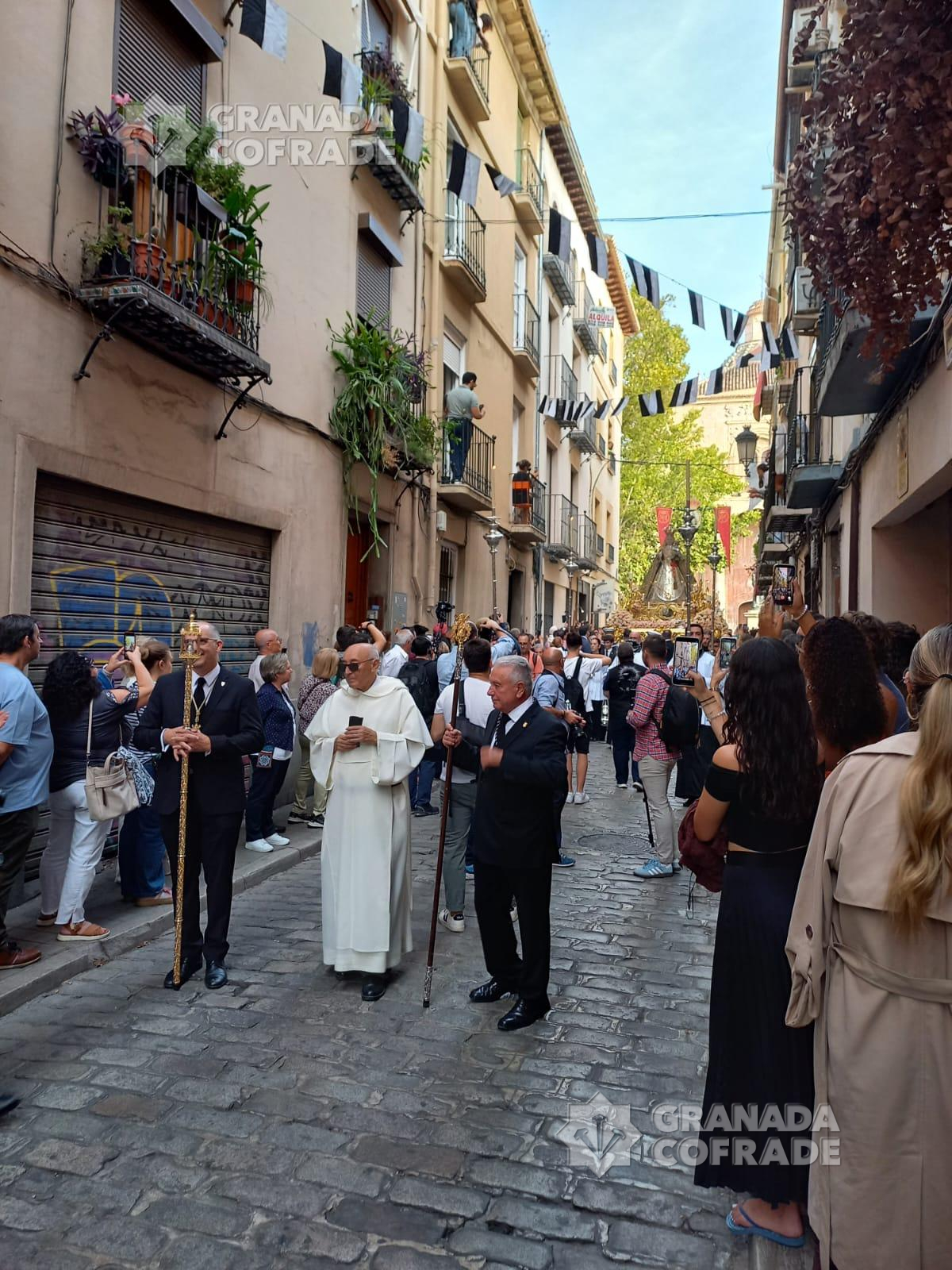 Por delante, la banda de tambores y cornetas de Jesús Despojado y numerosas representaciones de las hermandades del barrio y de otras llegadas de varios puntos de la provincia de Granada con la advocación de la Virgen el Rosario, Damas y Caballeros de la Virgen del Carmen, de las Carmelitas Descalzas, comunidad de dominicos y la presidencia del Ayuntamiento de Granada, con los ediles Francis Almohalla, Carolina Amate, Mónica Rodríguez y Juanjo Ibáñez. Estaba el Subdelegado de Defensa, Federico González-Vico, además de la participación de los colegiales del Colegio del Rosario y de Santo Domingo, de las Vistillas, y una participación de hermanos con las tradicionales hachetas en sus manos, estrenadas el pasado año. También los mayordomos del presente año, Ramón Burgos y Encarna Ximénez. El paso de la Virgen iba iluminado en las esquinas por los candelabros de guardabrisas cedidos por la hermandad de la Oración en el Huerto y adornado con rosas color rosáceo principalmente, además de otras variedades de flor en menor número.