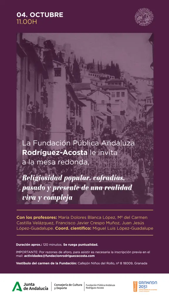 El próximo sábado 4 de octubre celebra la Fundación Rodríguez Acosta (Callejón Niños del Rollo, 8), una mesa redonda muy especial: Religiosidad popular y cofradías: pasado y presente de una realidad viva y compleja” que estará coordinada por el prof. y cat. Miguel Luis López -Guadalupe. La mesa redoda se celebrará en el vestíbulo del carmen de la Fundación contando con la participación de cuatro especialistas en diversas materias, con la intención de aportar sus testimonios sobre la realidad cofrade de Granada, en el pasado y en el presente, con su lógica proyección hacia el futuro.