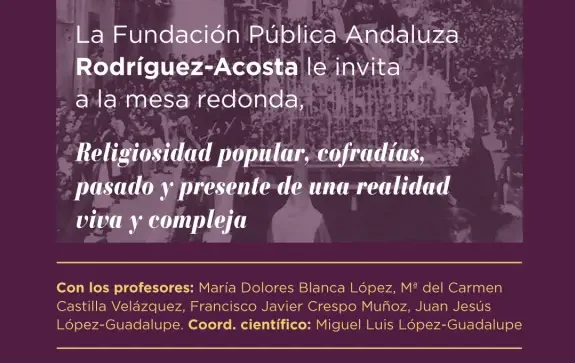 El próximo sábado 4 de octubre celebra la Fundación Rodríguez Acosta (Callejón Niños del Rollo, 8), una mesa redonda muy especial: Religiosidad popular y cofradías: pasado y presente de una realidad viva y compleja” que estará coordinada por el prof. y cat. Miguel Luis López -Guadalupe. La mesa redoda se celebrará en el vestíbulo del carmen de la Fundación contando con la participación de cuatro especialistas en diversas materias, con la intención de aportar sus testimonios sobre la realidad cofrade de Granada, en el pasado y en el presente, con su lógica proyección hacia el futuro.