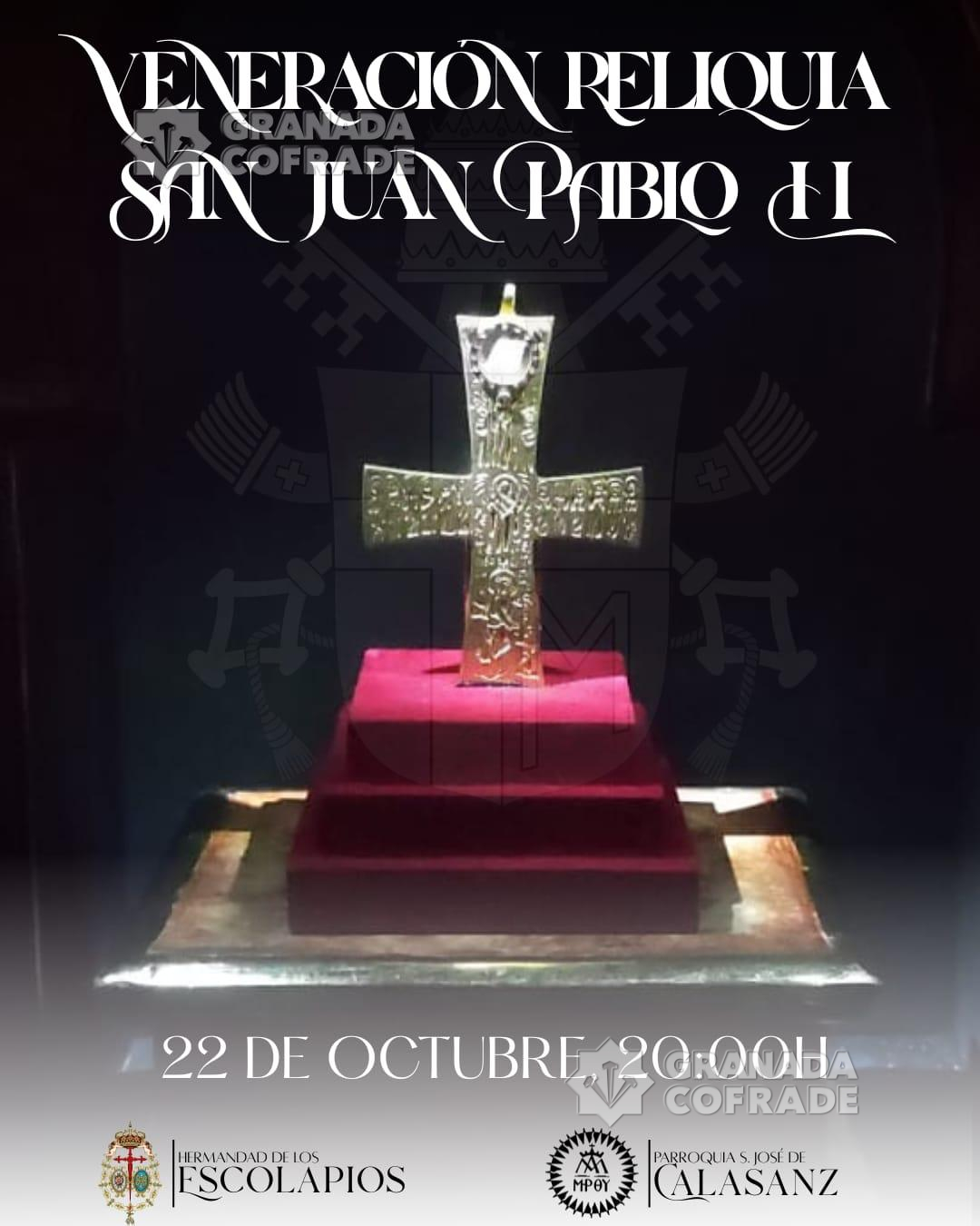La vinculación de la cofradía del Santísimo Cristo de la Expiración (Escolapios) con el Papa San Juan Pablo II continúa muy viva en esta cofradía de las Escuelas Pías y en este miércoles, 22 de Octubre, se celebrará en la parroquia de San José de Calasanz una veneración y Eucaristía con la reliquia del Santo Padre. Dará comienzo a las ocho de la noche presidida por el párroco y director espiritual de la hermandad, Juan Bautista Amat. Desde la cofradía «invitan a todos a participar con fe y devoción en este momento tan especial de encuentro y oración, dando gracias por su intercesión y ejemplo de vida cristiana».