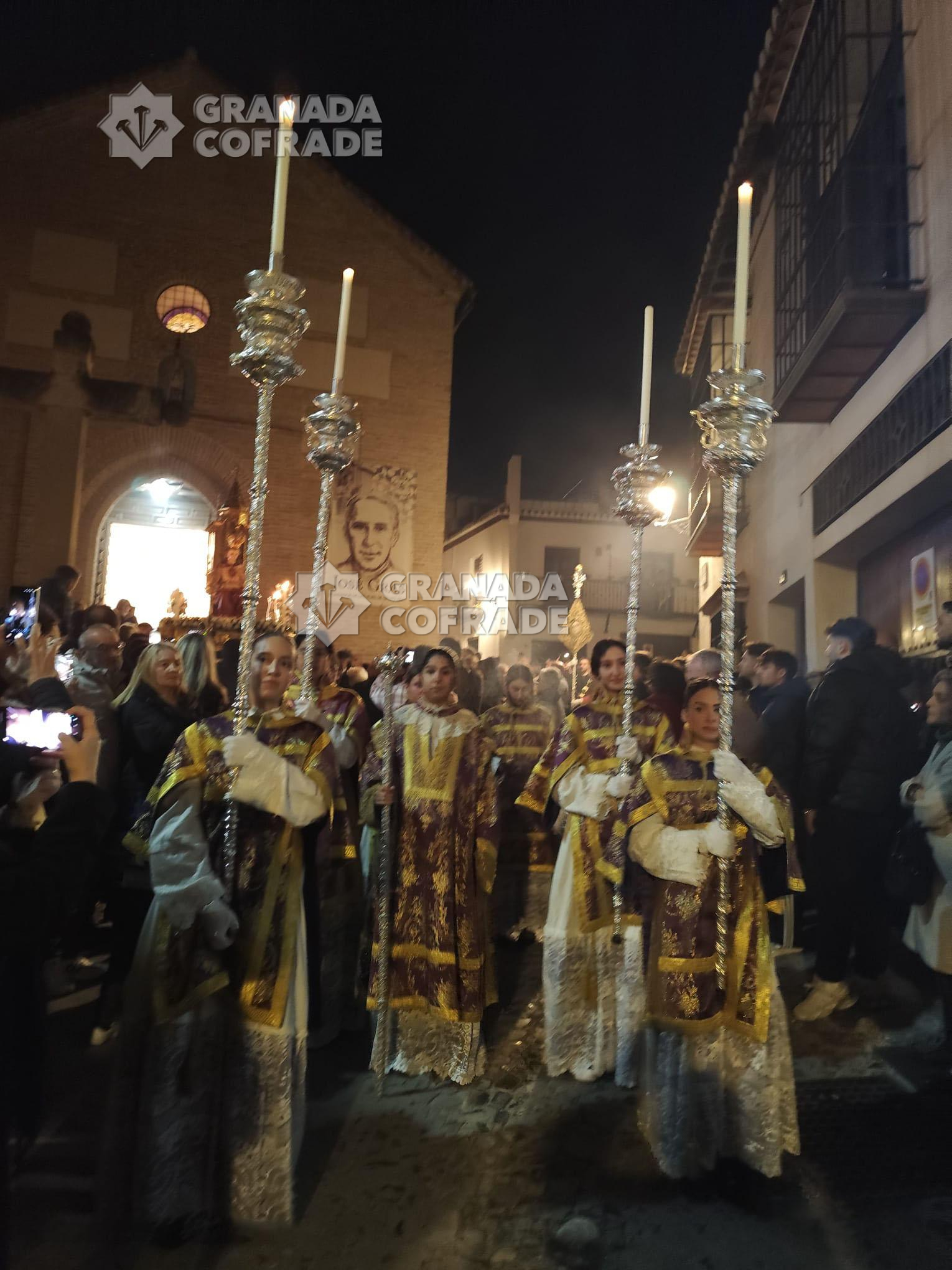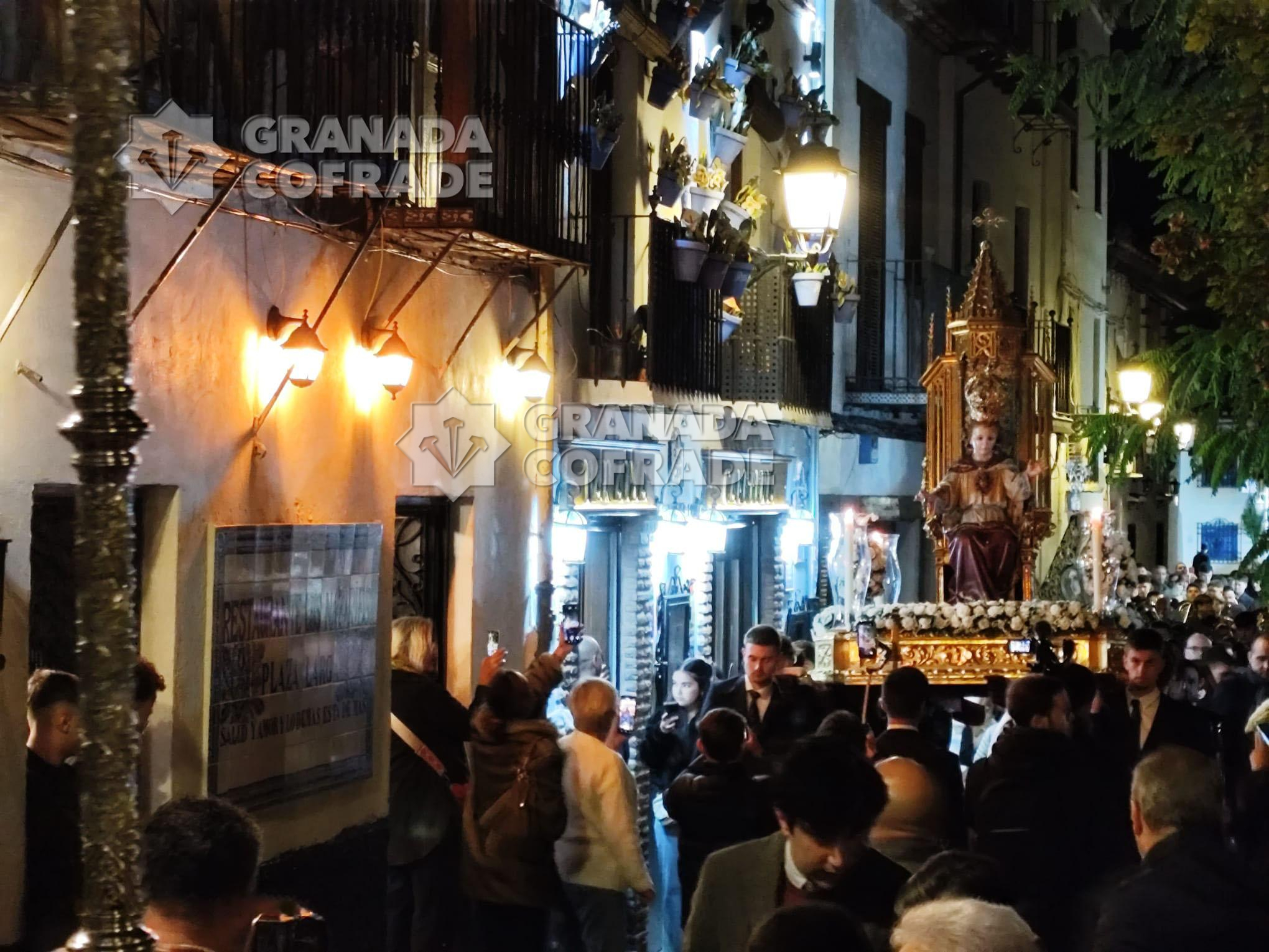 Tras el rezo, la procesión emprendió el camino de regreso al templo de San Gregorio, transitando de nuevo por las estrechas y emblemáticas calles del Albaicín, como Panaderos, Plaza Larga o la calle Agua del Albaicín, ante la atenta mirada de los vecinos y la expectación de los turistas. La procesión contó con representación institucional y religiosa. El cortejo estuvo acompañado por miembros de la Cofradía de Jesús de la Pasión y María Santísima de la Estrella, así como del Movimiento Apostólico Cristo Rey. La presidencia institucional estuvo compuesta por los concejales de Mantenimiento, Francisco Almohalla, y la de Educación, Encarnación González. Junto a ellos estuvieron María del Carmen Tovar, como representante del Patronato de la Fundación Educativa José Gras; Eugenio Almohalla, director del vecino colegio Divino Maestro; Luis Serrano, el director general del CES Cristo Rey; y como anfitriona, la superiora de la comunidad, Ángeles Carámbano HCR. Tras la talla, cerró el tramo religioso el sacerdote José Gabriel Martín, delegado Episcopal de Hermandades y Cofradías.