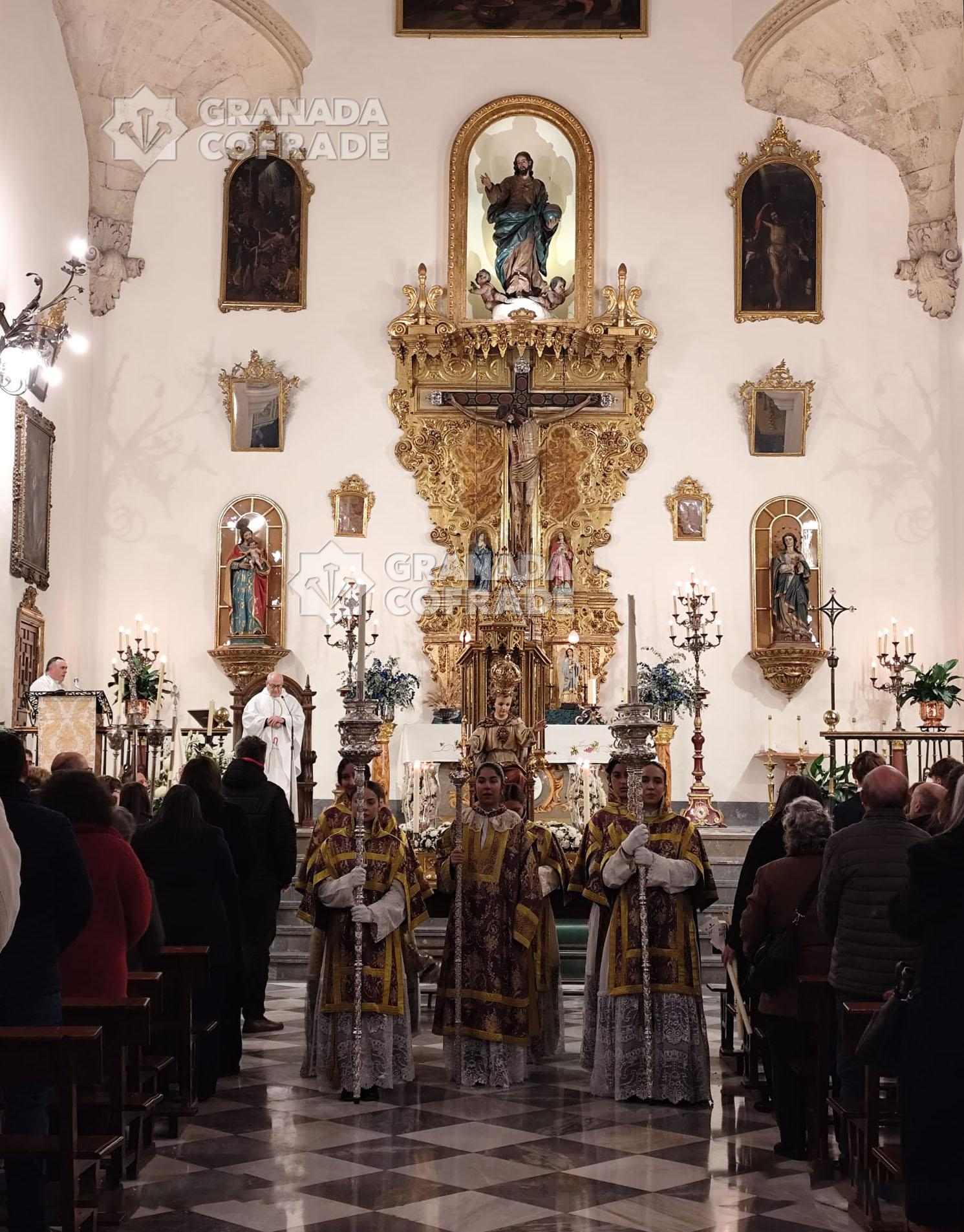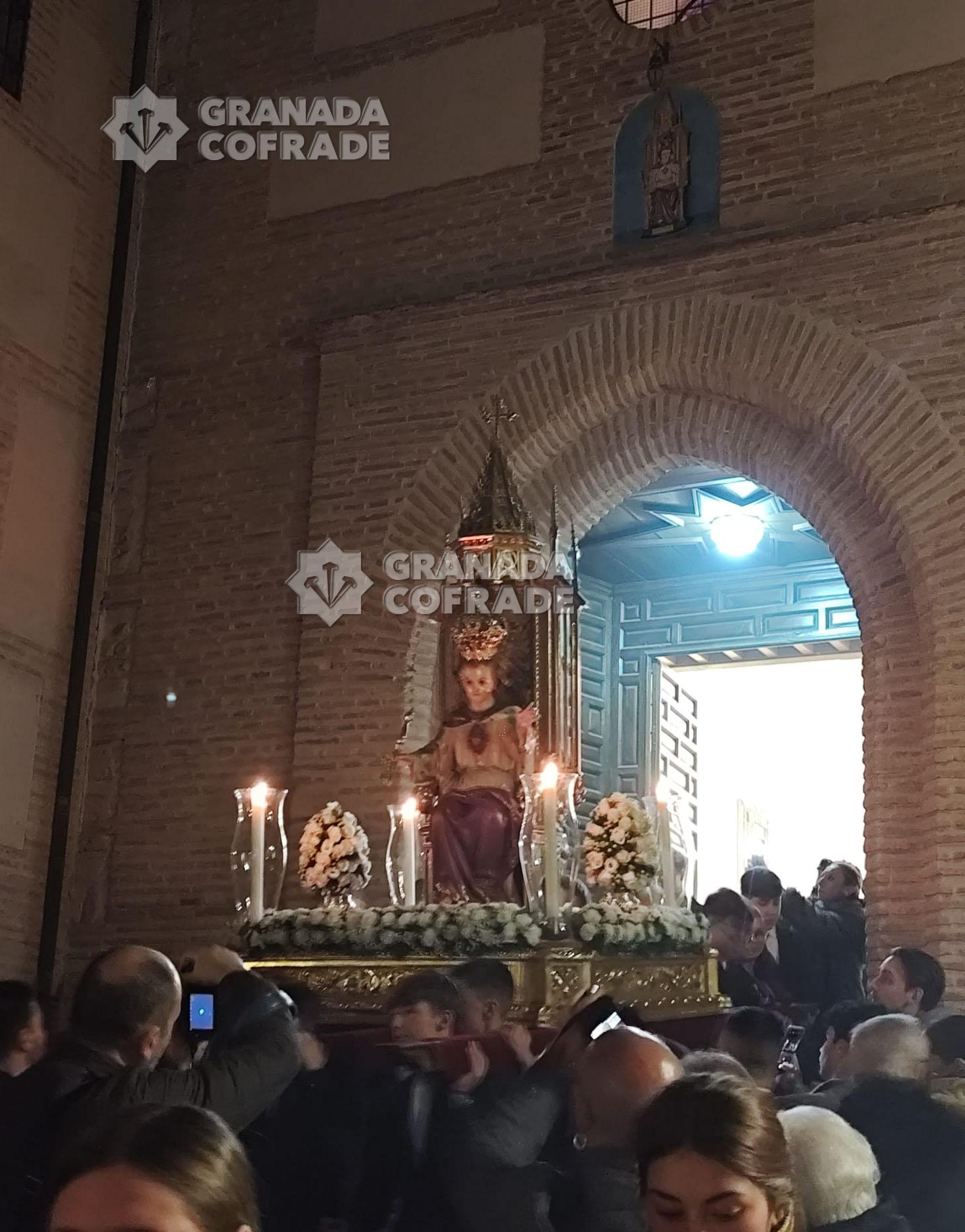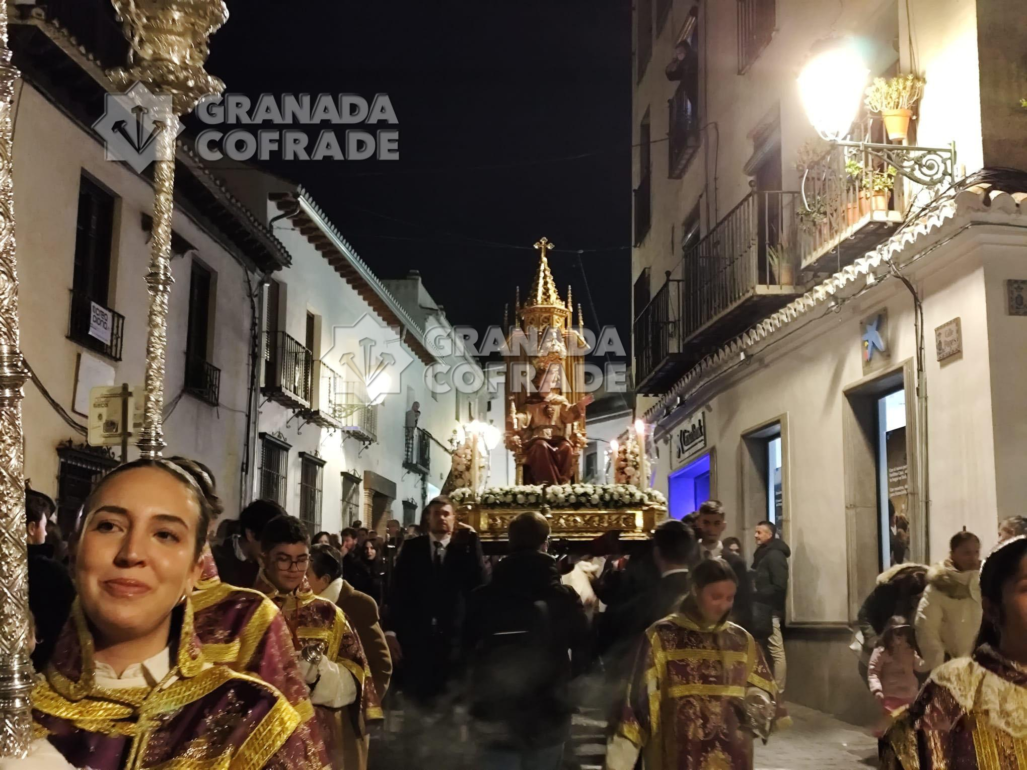 Tras el rezo, la procesión emprendió el camino de regreso al templo de San Gregorio, transitando de nuevo por las estrechas y emblemáticas calles del Albaicín, como Panaderos, Plaza Larga o la calle Agua del Albaicín, ante la atenta mirada de los vecinos y la expectación de los turistas. La procesión contó con representación institucional y religiosa. El cortejo estuvo acompañado por miembros de la Cofradía de Jesús de la Pasión y María Santísima de la Estrella, así como del Movimiento Apostólico Cristo Rey. La presidencia institucional estuvo compuesta por los concejales de Mantenimiento, Francisco Almohalla, y la de Educación, Encarnación González. Junto a ellos estuvieron María del Carmen Tovar, como representante del Patronato de la Fundación Educativa José Gras; Eugenio Almohalla, director del vecino colegio Divino Maestro; Luis Serrano, el director general del CES Cristo Rey; y como anfitriona, la superiora de la comunidad, Ángeles Carámbano HCR. Tras la talla, cerró el tramo religioso el sacerdote José Gabriel Martín, delegado Episcopal de Hermandades y Cofradías.