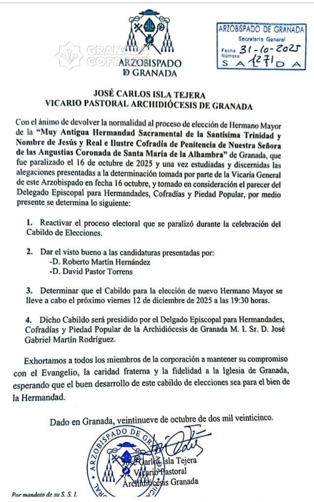 Desde la vicaría de Pastoral se exhorta «a todos los miembros de la corporación a mantener su compromiso con el Evangelio, la caridad fraterna y la fidelidad a la Iglesia de Granada, esperando que el buen desarrollo de este cabildo de elecciones sea para el bien de la Hermandad». El documento tiene fecha de salida del Arzobispado de Granada del 31 de octubre.