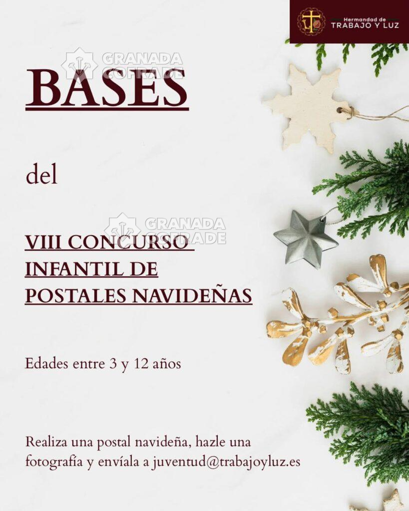 Del 10 de noviembre al 12 de diciembre, comprendiendo las edades de 3 a 12 años se pueden presentar en la casa de hermandad de la cofradía del Cristo del Trabajo, del Zaidín, los trabajos realizados por los niños para el VIII Concurso infantil de postales navideñas. Se pueden entregar en la Casa de Hermandad (Calle Venezuela nº35) de lunes a miércoles de 19:00h a 21:00h o bien, mandando un correo a juventud@trabajoyluz.es