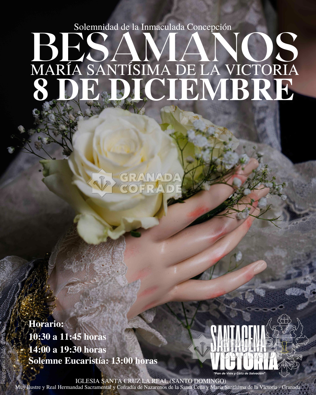 El próximo día 8 de Diciembre, lunes, con motivo de la solemnidad de la Inmaculada Concepción de María, la Hermandad Sacramental de la Santa Cena celebrará el tradicional Besamanos a María Santísima de la Victoria. El horario será de 10:30 a 11:45 y de 14:00 a 19:30 horas, debido a las celebraciones de la Eucaristía en la parroquia a las 10:00, 12:00, 13:00 y 20:00 horas.
