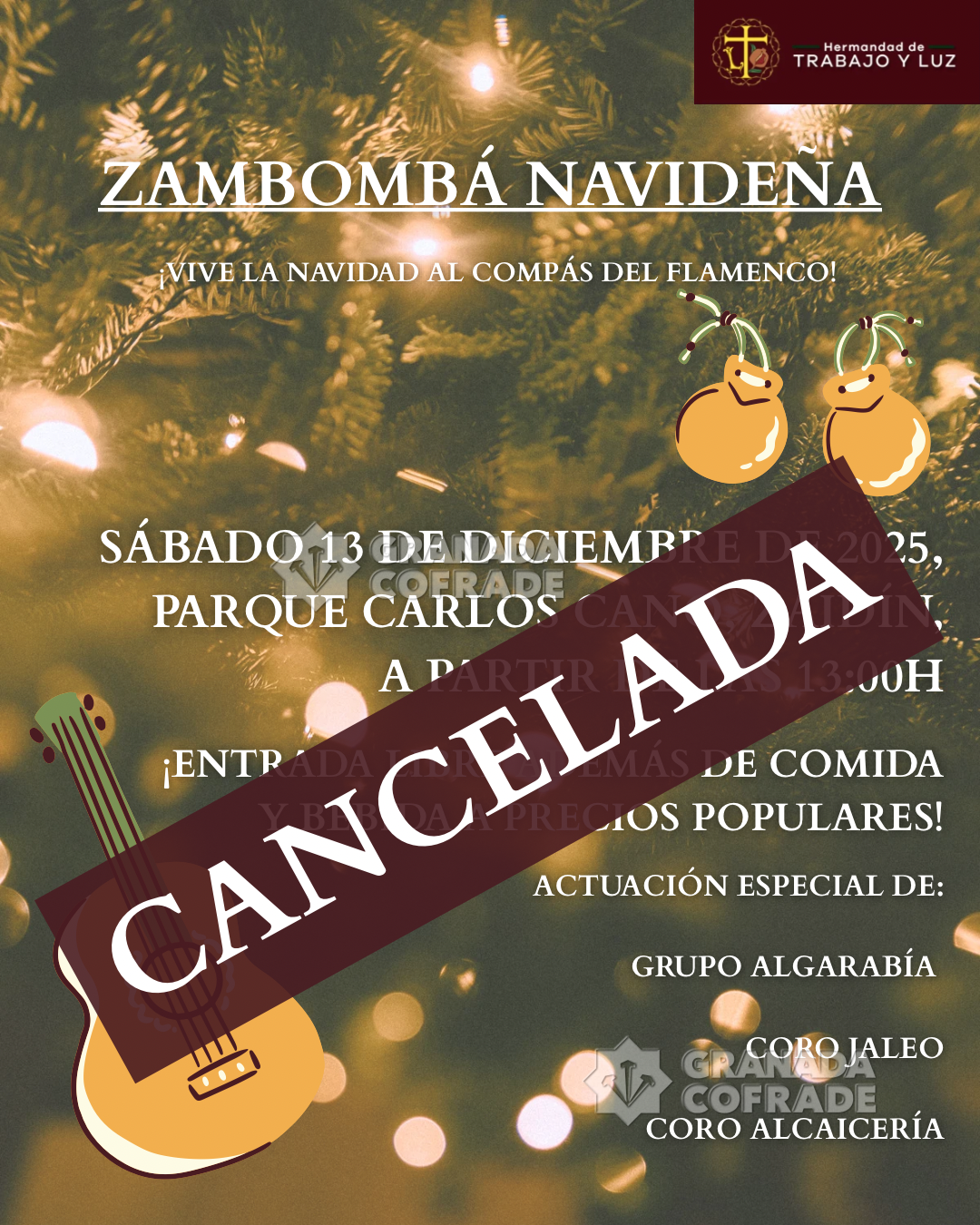 «Lamentamos comunicar la cancelación de la Zambombá que íbamos a celebrar el próximo sábado 13 de diciembre». Así lo ha comunicado la hermandad del Santísimo Cristo del Trabajo a nuestra redacción indicando que «por motivos totalmente ajenos a nuestra Hermandad y aun habiendo presentado y solicitado los diferentes permisos necesarios con seis meses de antelación, a día de hoy, a solamente 2 días, no disponemos de permiso por parte del Ayuntamiento de Granada para la celebración», señalan desde la hermandad zaidinera de la parroquia del Corpus Christi. La previsión era el desarrollo de esta actividad en espacio público de la plaza de Carlos Cano.