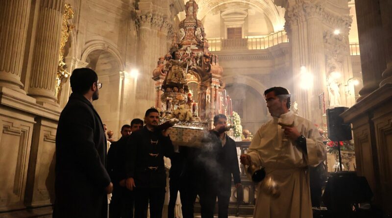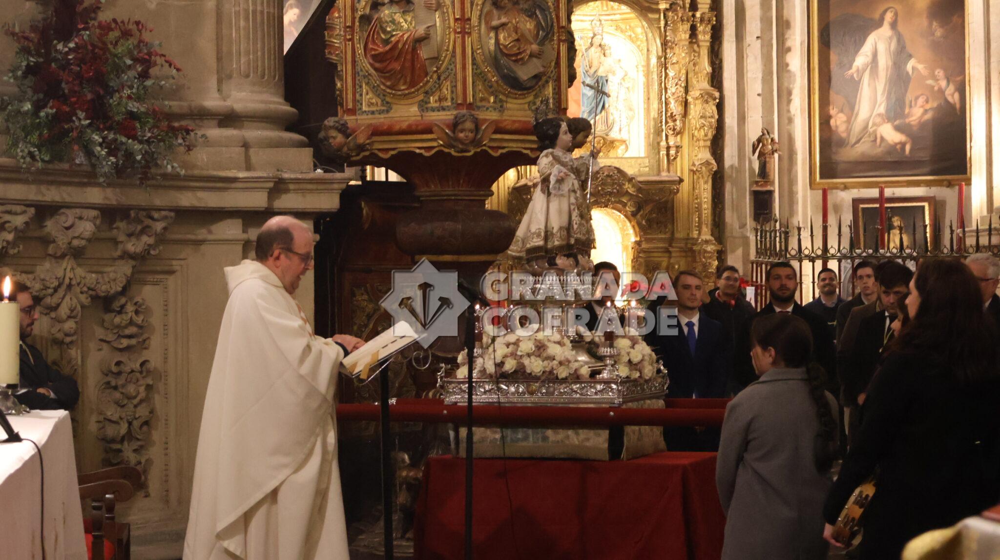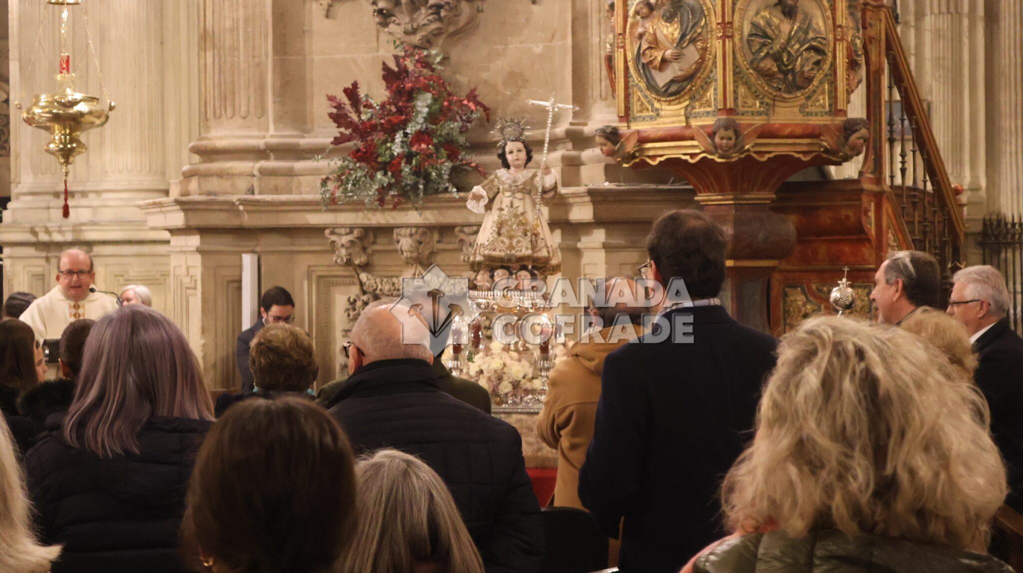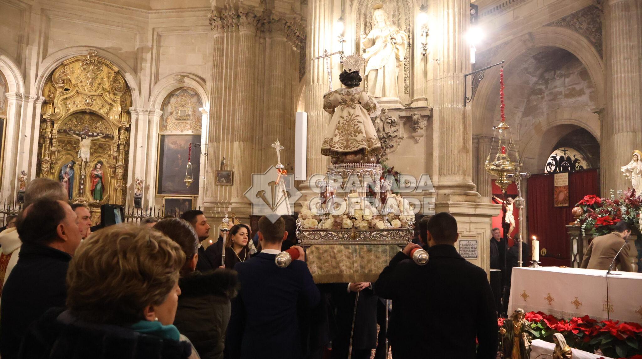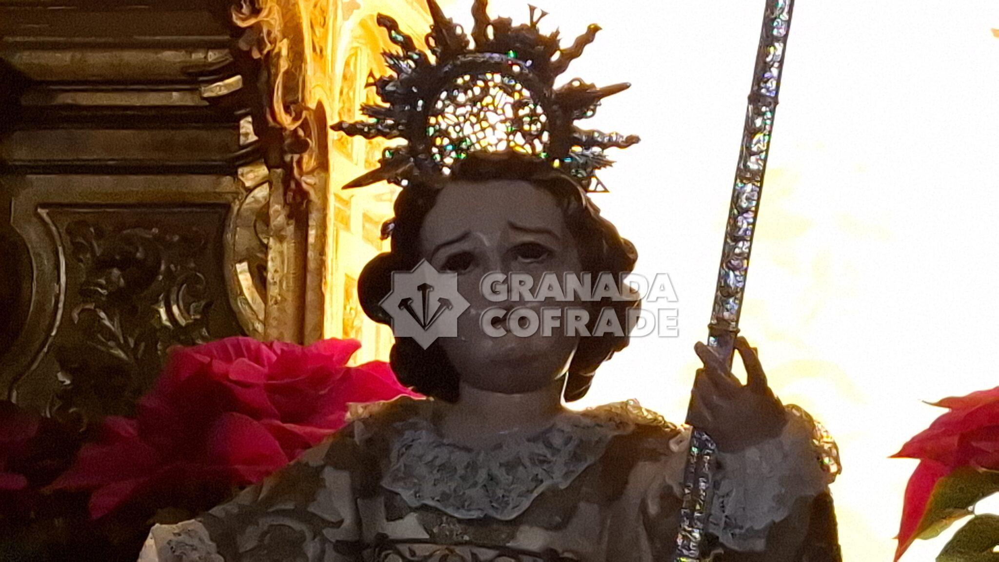 Era procesionada la imagen del Niño Jesús del Dulce Nombre sobre andas de plata perteneciente al patrimonio de la hermandad y portada por costaleros a las órdenes de Ricardo Mora. Villancicos populares y cantos para acompañar a la imagen obra atribuida a Diego de Mora, que vestía una de las doce túnicas que posé, bordada en oro sobre tejido blanco, del mismo color de las rosas de su adorno floral salpicadas con orquídeas.
