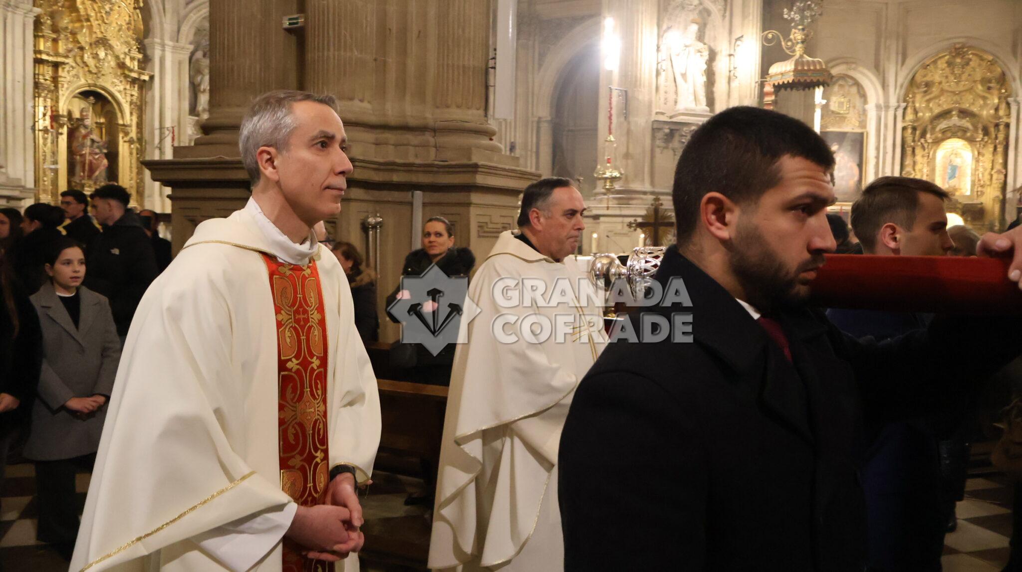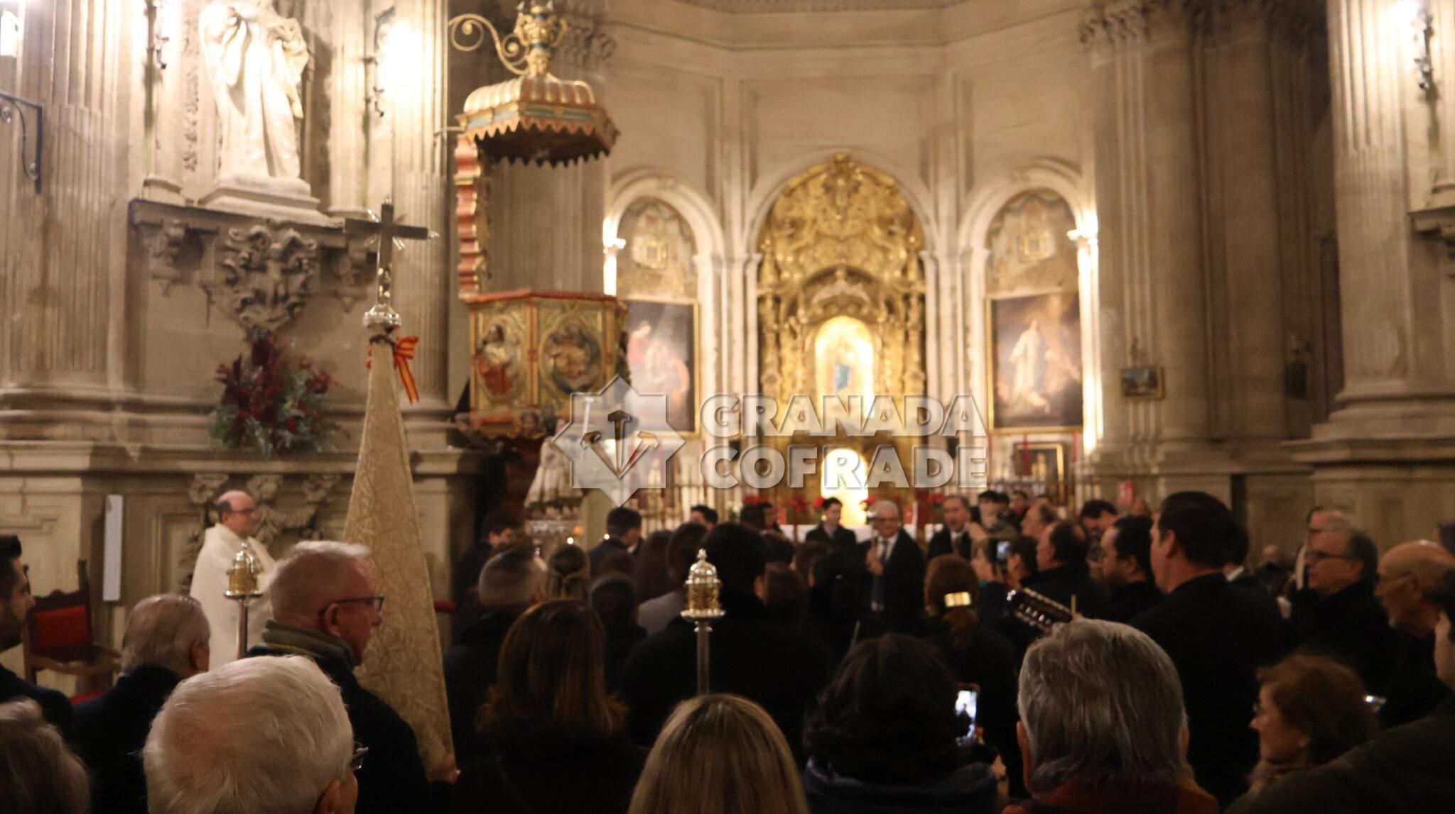 Función solemne que contó también con la participación del grupo de Coros y Danzas y de la organista María Angustias Linares. Al término de la Eucaristía se desarrolló la procesión claustral por el interior del templo del Sagrario, participada por varias parejas de hermanos, mayordomos y la junta de gobierno encabezada por el hermano mayor, Emilio Martín, y el secretario de la veterana corporación, Torcuato Labella. Estaban también hermanos veteranos de esta corporación que con su presencia también señalaban la veteranía de la hermandad.