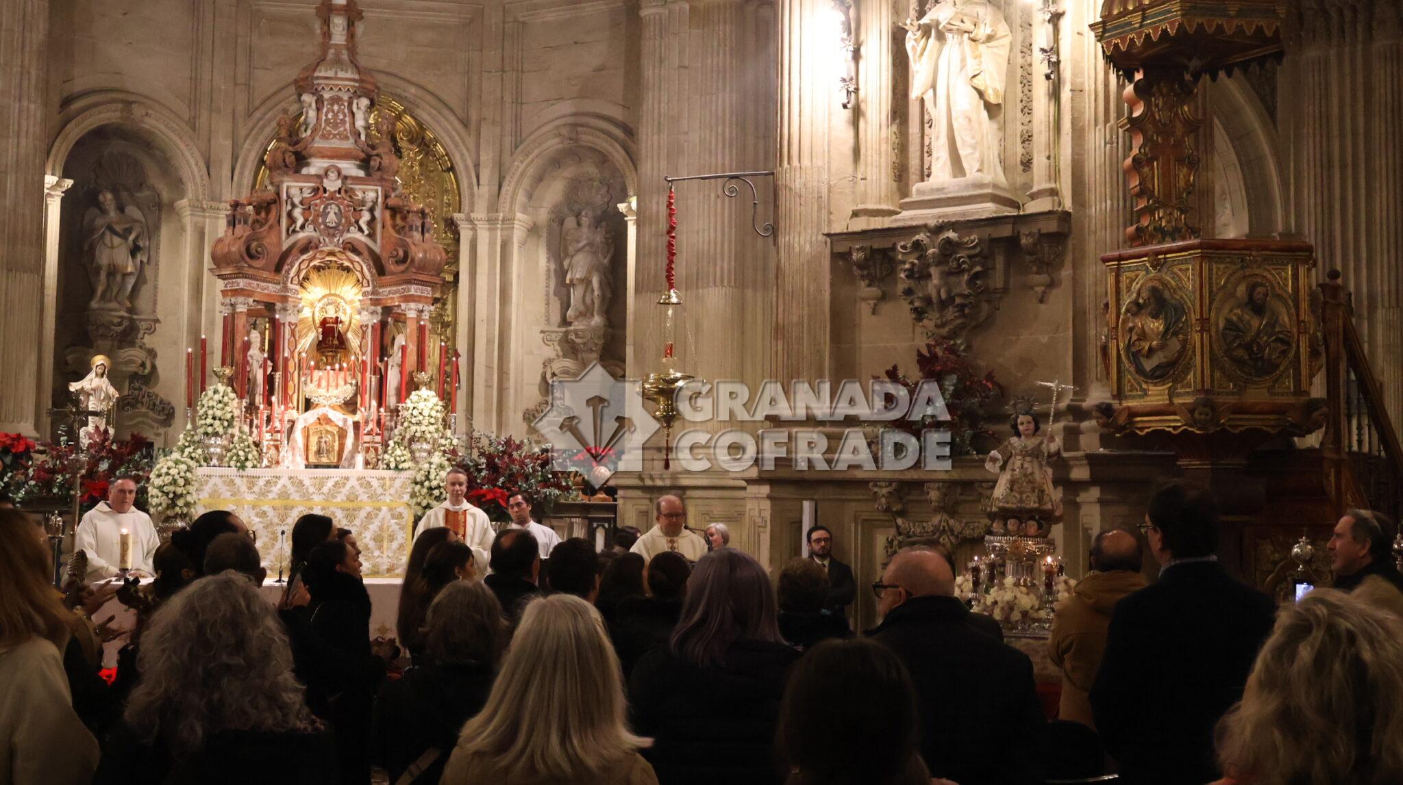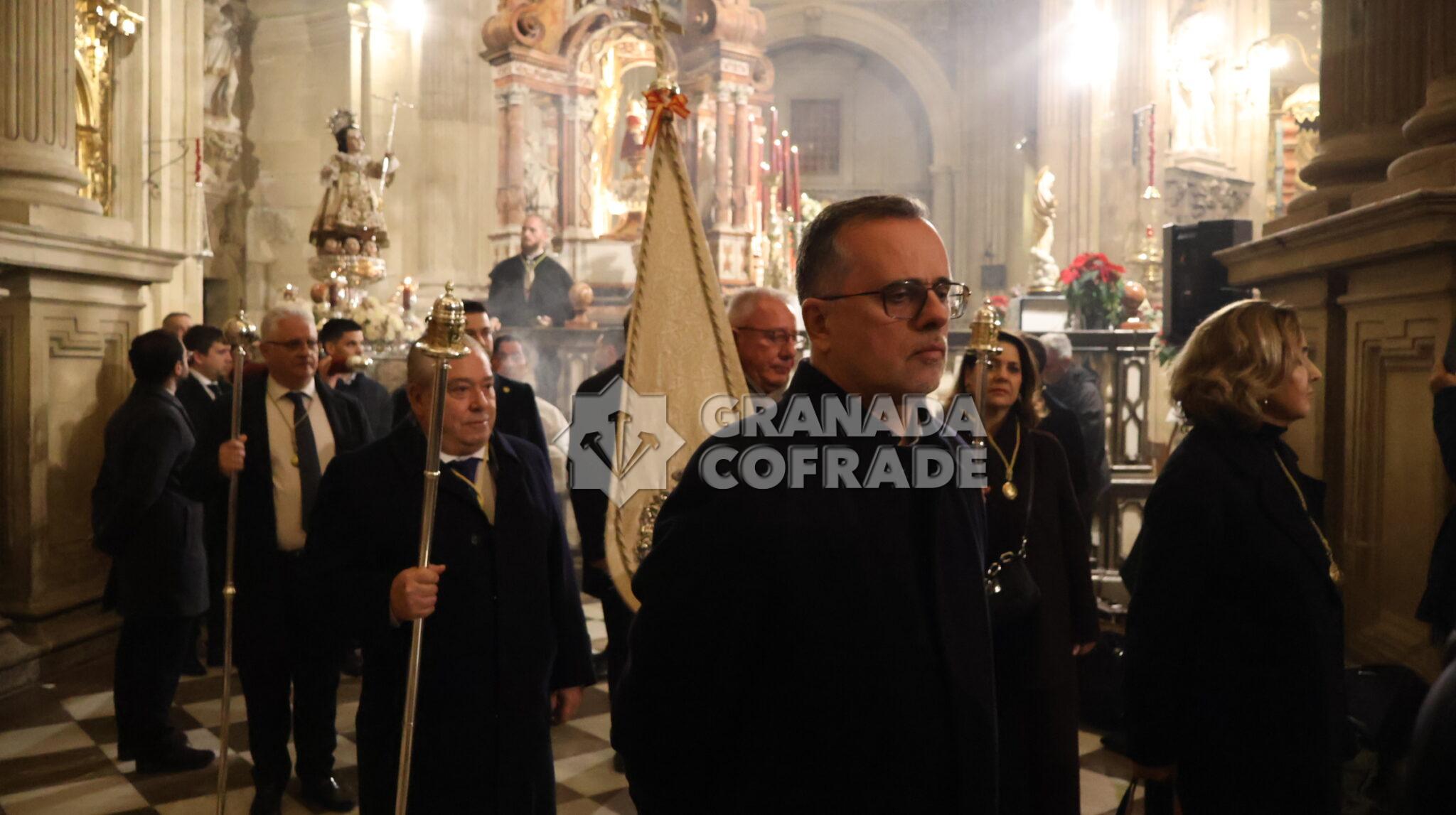 Función solemne que contó también con la participación del grupo de Coros y Danzas y de la organista María Angustias Linares. Al término de la Eucaristía se desarrolló la procesión claustral por el interior del templo del Sagrario, participada por varias parejas de hermanos, mayordomos y la junta de gobierno encabezada por el hermano mayor, Emilio Martín, y el secretario de la veterana corporación, Torcuato Labella. Estaban también hermanos veteranos de esta corporación que con su presencia también señalaban la veteranía de la hermandad.