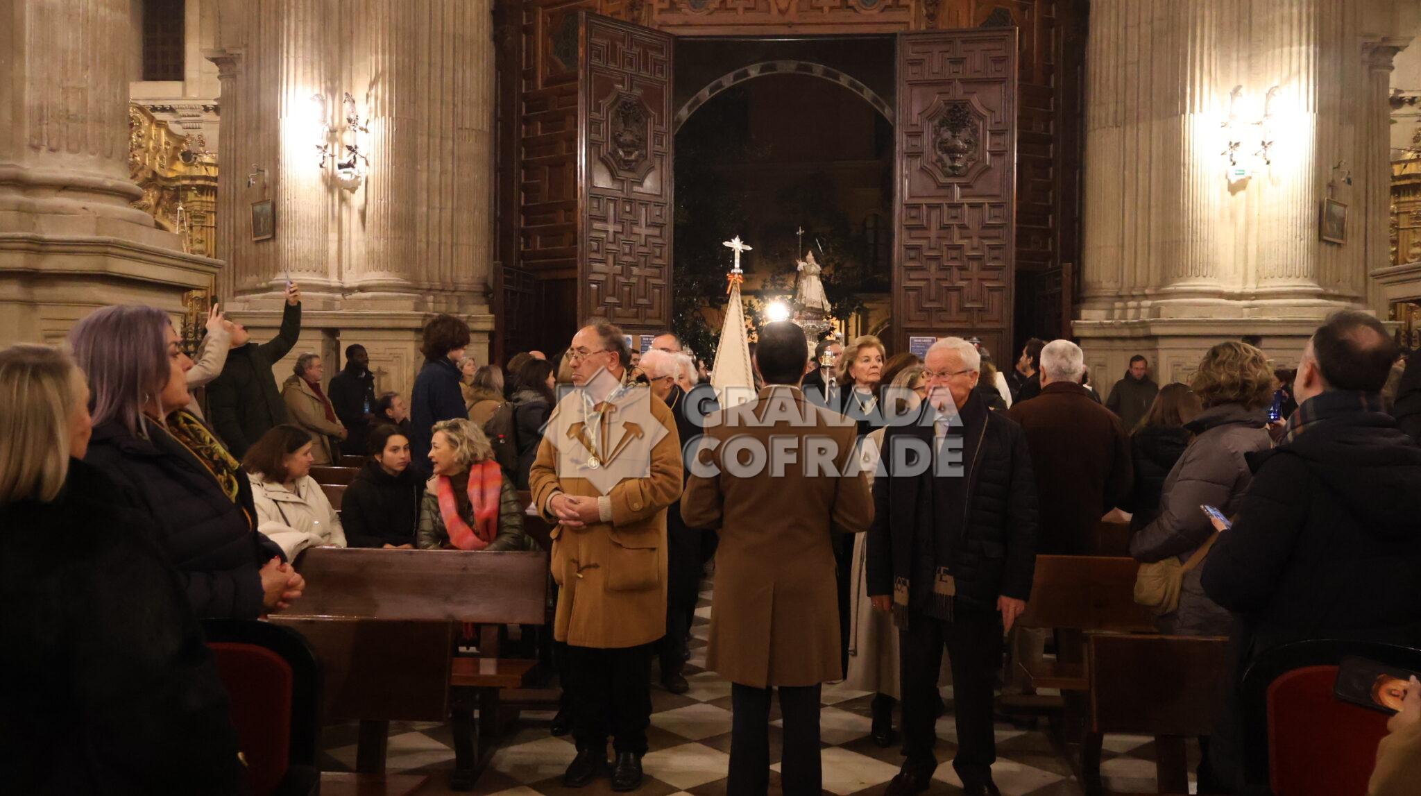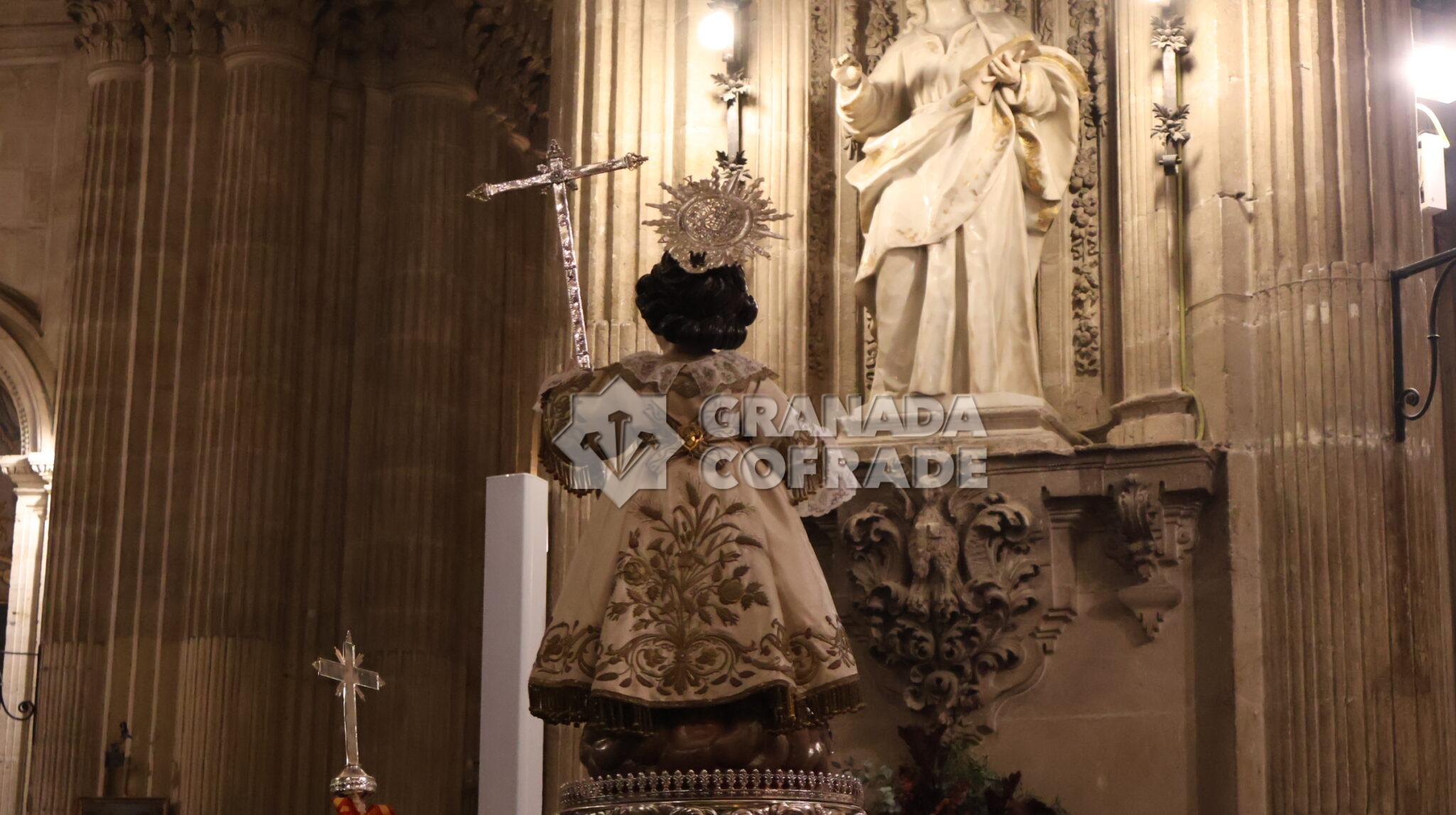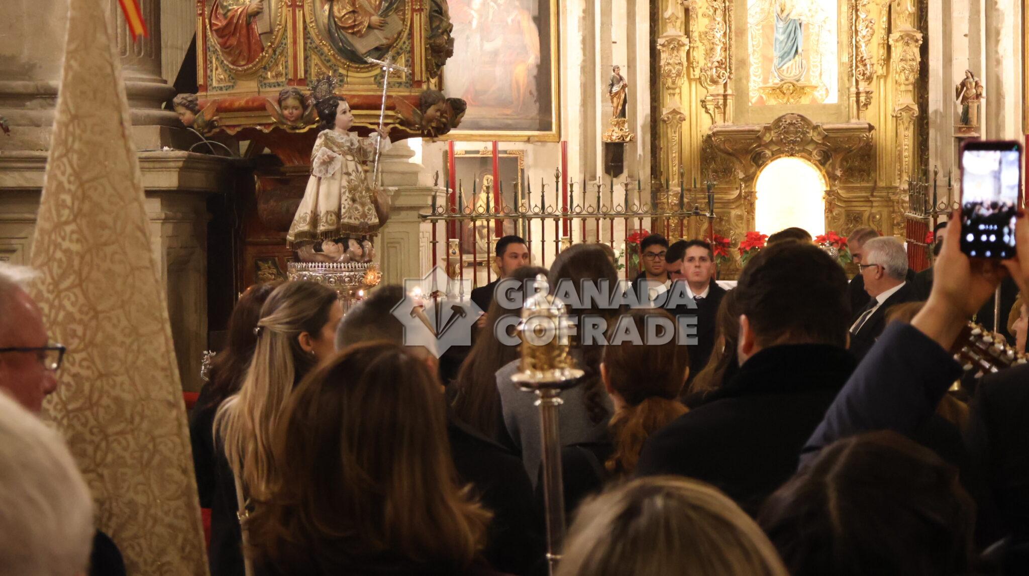 Era procesionada la imagen del Niño Jesús del Dulce Nombre sobre andas de plata perteneciente al patrimonio de la hermandad y portada por costaleros a las órdenes de Ricardo Mora. Villancicos populares y cantos para acompañar a la imagen obra atribuida a Diego de Mora, que vestía una de las doce túnicas que posé, bordada en oro sobre tejido blanco, del mismo color de las rosas de su adorno floral salpicadas con orquídeas.
