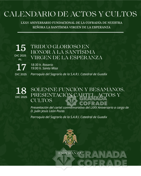 Celebra la cofradía de de Nuestra Señora de la Esperanza, de la localidad granadina de Guadix, los actos y cultos de su septuagésimo quino aniversario fundacional. Para conmemorarlo se han dispuesto una serie de actividades de toda índole, culturales, religiosas y sociales entre las que destaca el Via Crucis oficial de Federación. Estará presidido por la Virgen de la Esperanza junto al Santo Sepulcro, el cual tendrá lugar el 21 de febrero; así como la Santa Misa estacional de Acción de Gracias y Salida Extraordinaria de la Virgen Santísima que tendrá lugar el sábado 19 de septiembre. Estos actos se iniciaron en diciembre pasado y culminarán en la festividad litúrgica de Nuestra Señora de la Esperanza, el 18 de diciembre de este año.