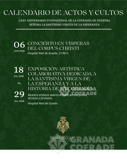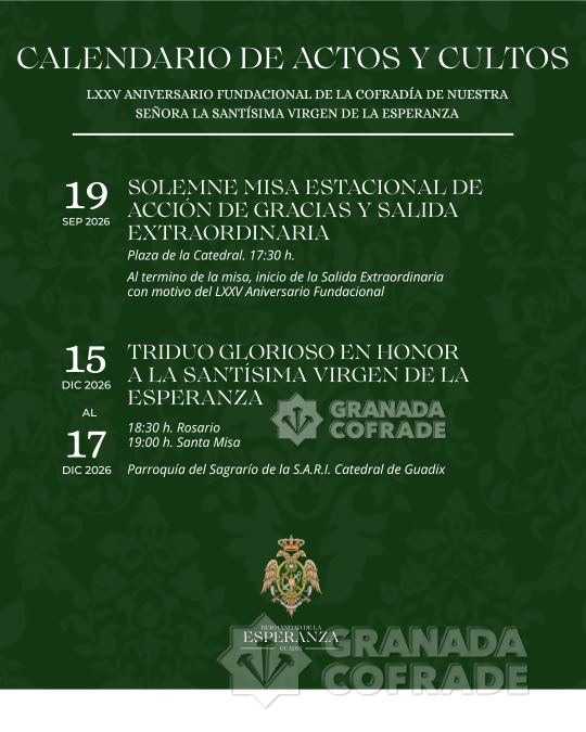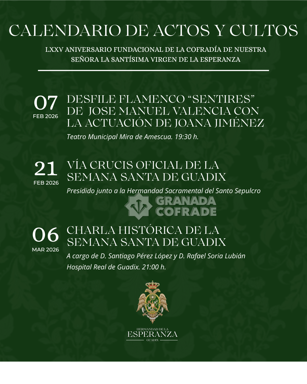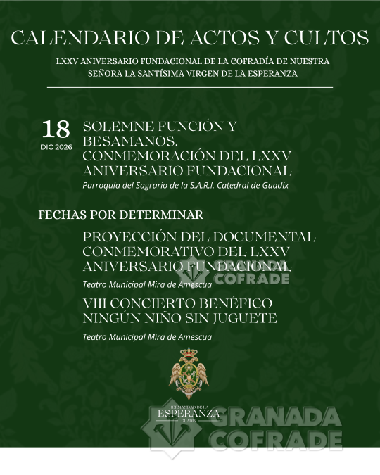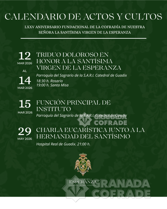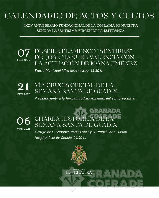 Celebra la cofradía de de Nuestra Señora de la Esperanza, de la localidad granadina de Guadix, los actos y cultos de su septuagésimo quino aniversario fundacional. Para conmemorarlo se han dispuesto una serie de actividades de toda índole, culturales, religiosas y sociales entre las que destaca el Via Crucis oficial de Federación. Estará presidido por la Virgen de la Esperanza junto al Santo Sepulcro, el cual tendrá lugar el 21 de febrero; así como la Santa Misa estacional de Acción de Gracias y Salida Extraordinaria de la Virgen Santísima que tendrá lugar el sábado 19 de septiembre. Estos actos se iniciaron en diciembre pasado y culminarán en la festividad litúrgica de Nuestra Señora de la Esperanza, el 18 de diciembre de este año.