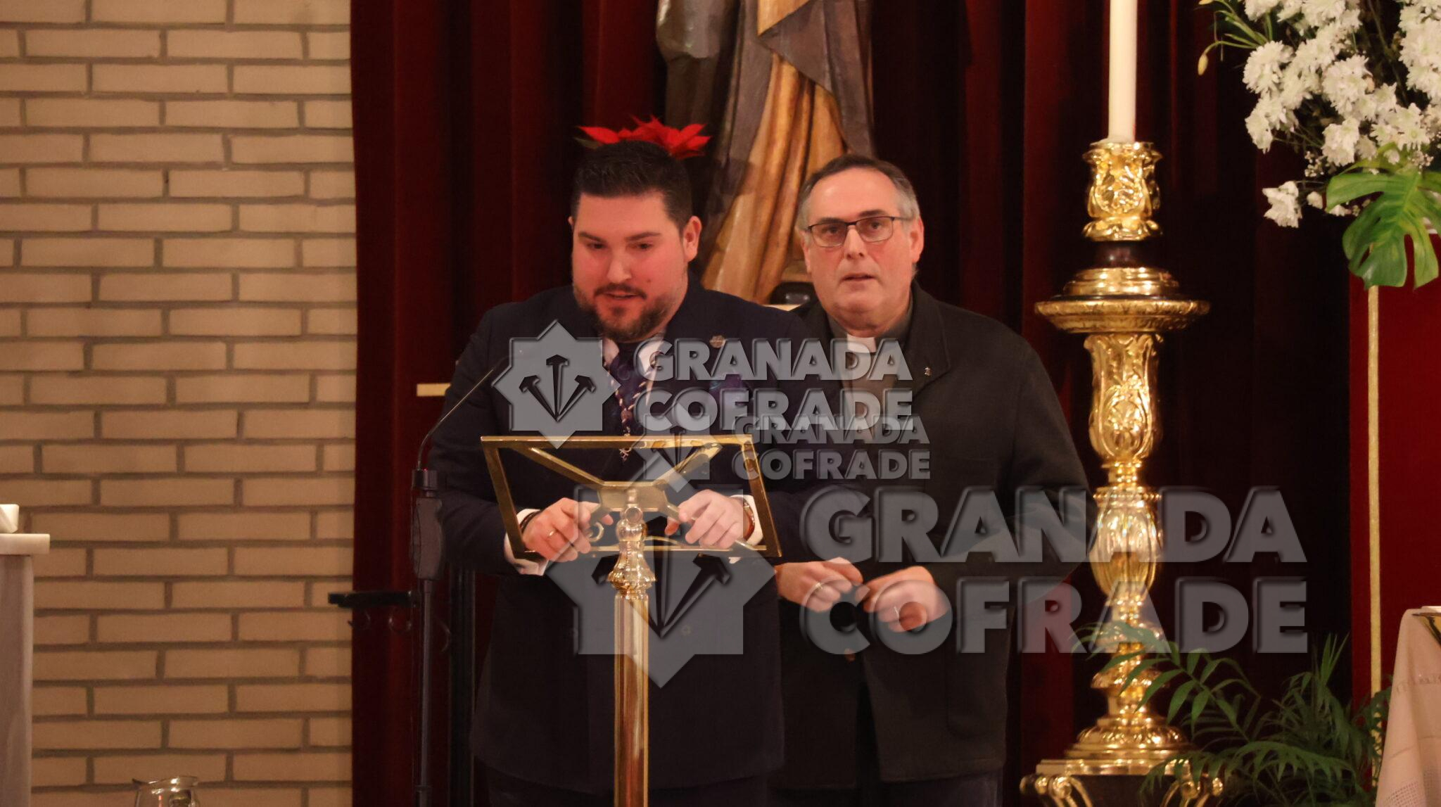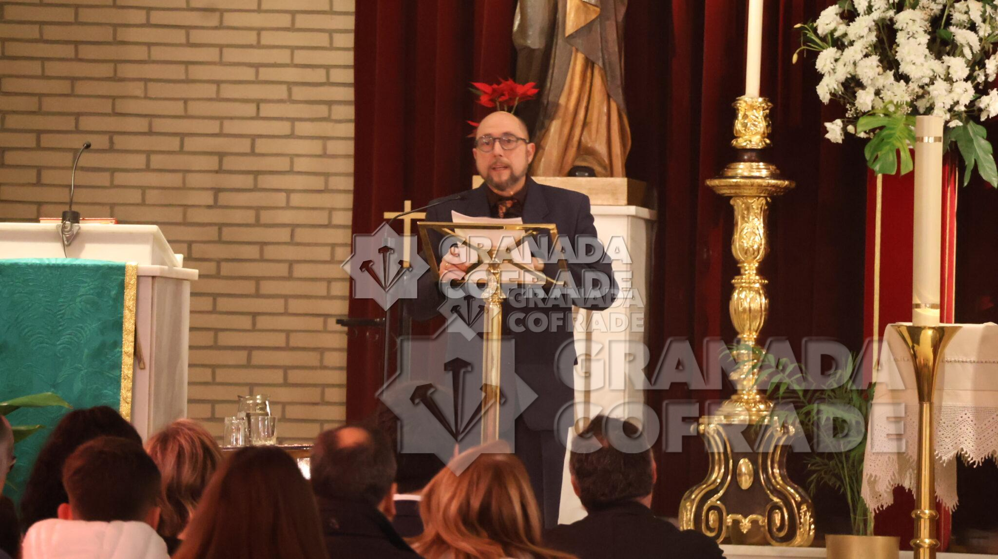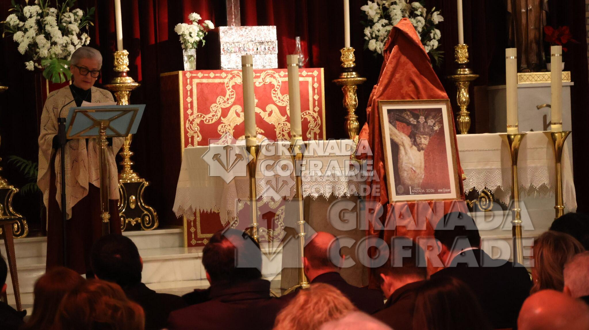 Con el recuerdo a los años que la cofradía de la Sagrada Lanzada no ha podido realizar su estación penitencial el Martes Santo, inició sus palabras de presentación del cartel de este año la locutora de radio, Emilia Cayuela García. Una breve presentación que se centró en su vinculación con la cofradía y con la comunidad parroquial «porque vosotros sois mi familia» y con la descripción del cartel que la presentadora calificó de solidario ya que el importe de lo aportado por los hermanos y allegados para que su instantánea personal «del rostro al Cristo de la Lanzada» tiene el fin deseado de la aportación económica destinada a la ayuda a las familias con niños oncológicos «Aupa» y la aportación a las necesidades para un mejor seguimiento de la enfermedad. «Es un cartel familiar, un cartel humano dentro de lo divino, un cartel con un sólo Señor, una sola fe y un sólo corazón en el cual Manuel Puga ha hecho un mosaico con todas las fotos, con todas las almas presentes y ausentes que hemos querido participar en este acto de caridad y compromiso con la Asociación Aupa Granada». Estaba en la parroquia de Nuestra Señora de los Dolores la vocal de esta Asociación Leticia Mateos.