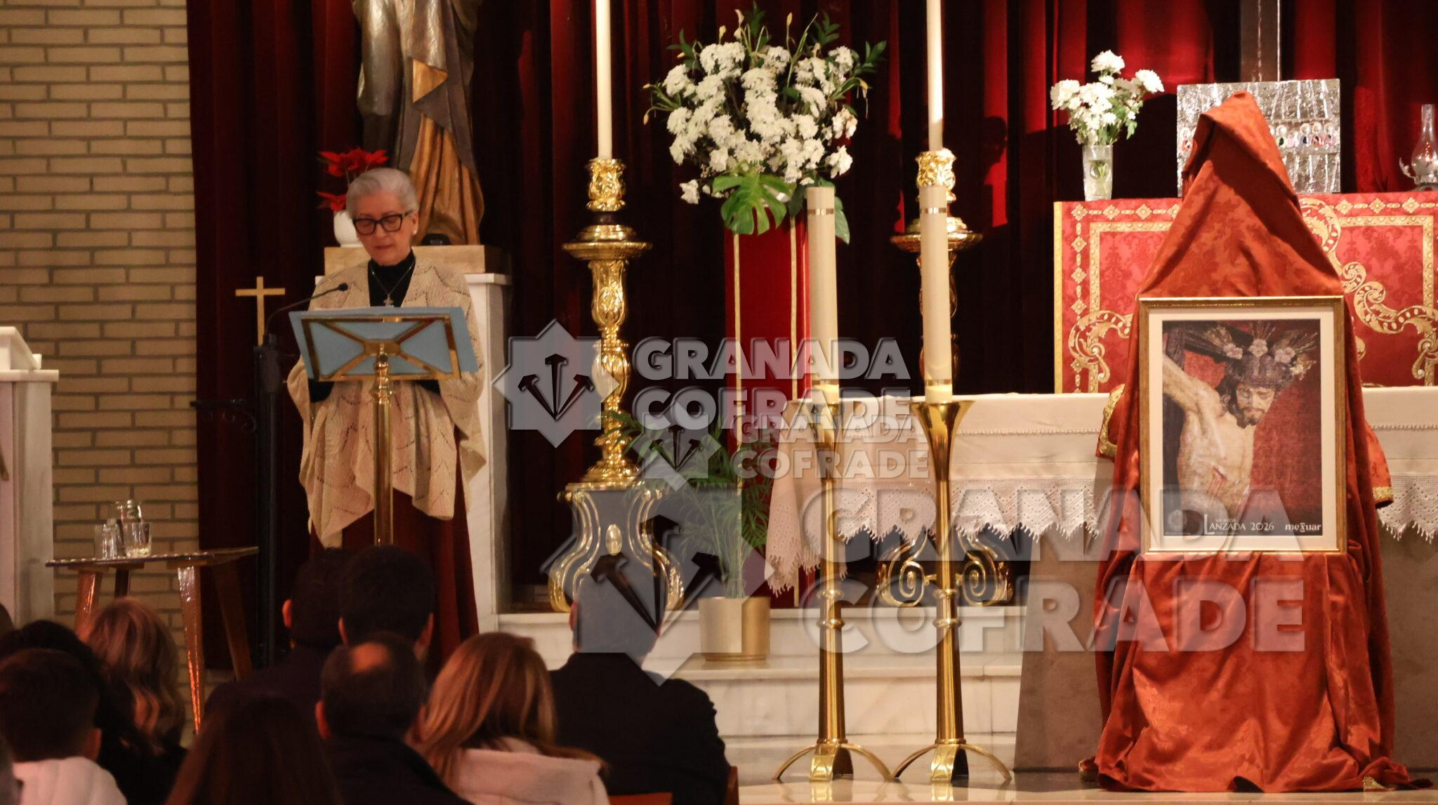 Con el recuerdo a los años que la cofradía de la Sagrada Lanzada no ha podido realizar su estación penitencial el Martes Santo, inició sus palabras de presentación del cartel de este año la locutora de radio, Emilia Cayuela García. Una breve presentación que se centró en su vinculación con la cofradía y con la comunidad parroquial «porque vosotros sois mi familia» y con la descripción del cartel que la presentadora calificó de solidario ya que el importe de lo aportado por los hermanos y allegados para que su instantánea personal «del rostro al Cristo de la Lanzada» tiene el fin deseado de la aportación económica destinada a la ayuda a las familias con niños oncológicos «Aupa» y la aportación a las necesidades para un mejor seguimiento de la enfermedad. «Es un cartel familiar, un cartel humano dentro de lo divino, un cartel con un sólo Señor, una sola fe y un sólo corazón en el cual Manuel Puga ha hecho un mosaico con todas las fotos, con todas las almas presentes y ausentes que hemos querido participar en este acto de caridad y compromiso con la Asociación Aupa Granada». Estaba en la parroquia de Nuestra Señora de los Dolores la vocal de esta Asociación Leticia Mateos.