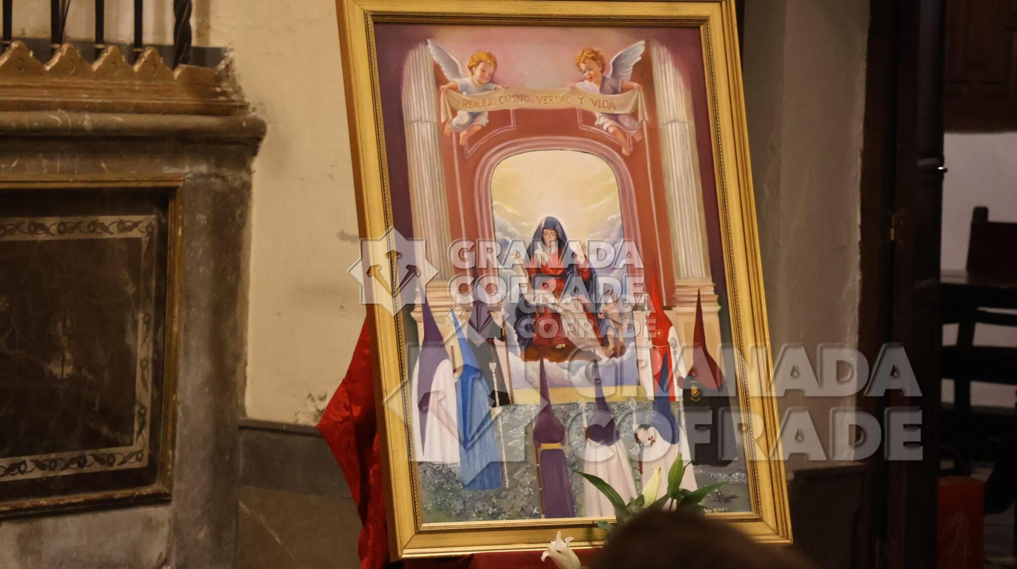 «Las manos de nuestra hermana Paloma han querido traer a nuestros ojos hoy, esta obra de arte, de un óleo sobre lienzo donde están las ocho hermandades penitenciales que formamos la nómina de la Semana Santa del barrio del Realejo». Con estas breves palabras del comienzo el presentador del cartel de la Semana Santa de este señero barrio inició su presentación de esta obra que «quiere representar como fácilmente se advierte, la portada de la iglesia de Santa Cruz la Real cuyos portones quedan abiertos a la entrada hacia el cielo, hacia la gloria, y en la puerta, la mediadora María, la Soledad de Nuestra Señora». Describió con pulcritud el cuadro que recoge la plaza de Santo Domingo con la iglesia dominica rodada de uno nazareno de cada una de las ocho cofradías que forman parte de la nómina de hermandades del barrio del Realejo «sosteniendo las varas que recogen los escudos de estas cofradías». En primer lugar, flanquean la puerta los de las cofradías de la Santa Cena y Señor de la Humildad «por estar ambas celebrando su centenario». Indicó el presentador que el cartel se timbra con la reproducción de «dos enviados de Dios, dos ángeles de aspecto juvenil que sustentan el lema para la Semana Santa de 2026 de nuestro barrio: Realejo, camino, verdad y vida».