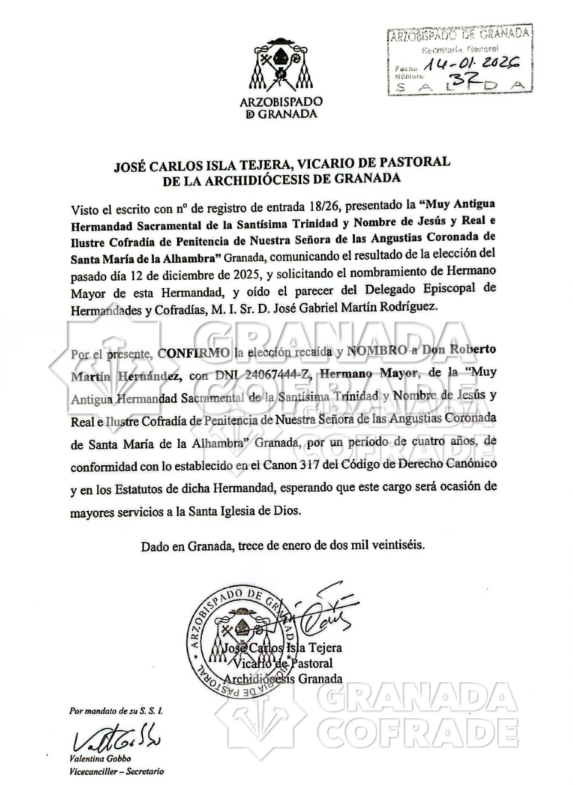 El Arzobispado de Granada ha ratificado ya, con fecha 13 de enero, al nuevo hermano mayor de la cofradía de Santa María de la Alhambra, Roberto Martín Hernández, después del proceso electoral que se prolongó por espacio mayor al deseado desde octubre a diciembre del pasado año. Un documento firmado por el Vicario de Pastoral de la Diócesis granadina «esperando que este cargo sea de mayores servicios a la Santa Iglesia de Dios», como refleja en el documento. El nuevo hermano mayor designará ahora su junta de gobierno y habrá de mandarlo también para la aprobación por la Curia Eclesiástica.