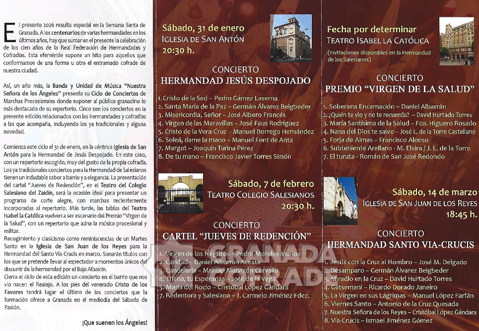 La Banda y Unidad de música de los Ángeles, de Granada, bajo la dirección de Manuel Elvira ha dispuesto un año más la celebración de un ciclo de conciertos de marchas procesionales que este año tiene en el horizonte la celebración del centenario de la Federación de Cofradías. De esta manera la Banda y Unidad de Música “Nuestra Señora de los Ángeles” presenta su Ciclo de Conciertos de Marchas Procesionales donde exponer al público granadino lo más destacado de su repertorio. Cinco son los conciertos en la presente edición relacionados con las hermandades y cofradías a las que acompaña, incluyendo algunos ya tradicionales y alguna novedad.