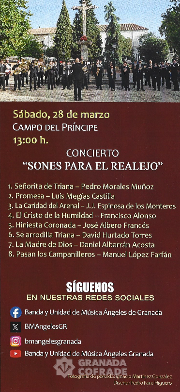 Cierra el ciclo de esta edición un concierto en el Realejo. A los pies del venerado Cristo de los Favores tendrá lugar el último de los conciertos que la formación ofrece a Granada en el mediodía del Sábado de Pasión. Para esta ocasión, el programa escogido pretende ser la antesala de la Semana Santa que se avecina, con títulos tan sugerentes como Promesa de Luis Megías, La Caridad del Arenal de Espinosa de los Monteros, Hiniesta Coronada de Albero, El Cristo de la Humildad de Francisco Alonso, La Madre de Dios de Albarrán o Pasan los Campanilleros de López Farfán.