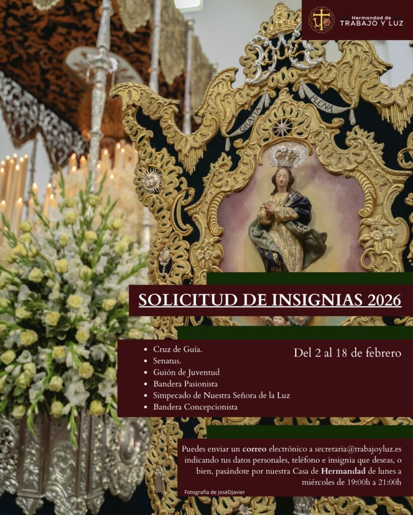 Desde el 2 al 18 de febrero abre la cofradía del Cristo del Trabajo y Nuestra Señora de la Luz, del Zaidín, el plazo para solicitar portar una insignia el próximo Lunes Santo en la estación de penitencia de este año. Para solicitarla se puede enviar un correo a secretaria@trabajoyluz.es indicando datos personales, teléfono e insignia que se desea o acudiendo a la Casa de Hermandad de lunes a miércoles de 19:00h a 21:00 horas, para solicitarlo.