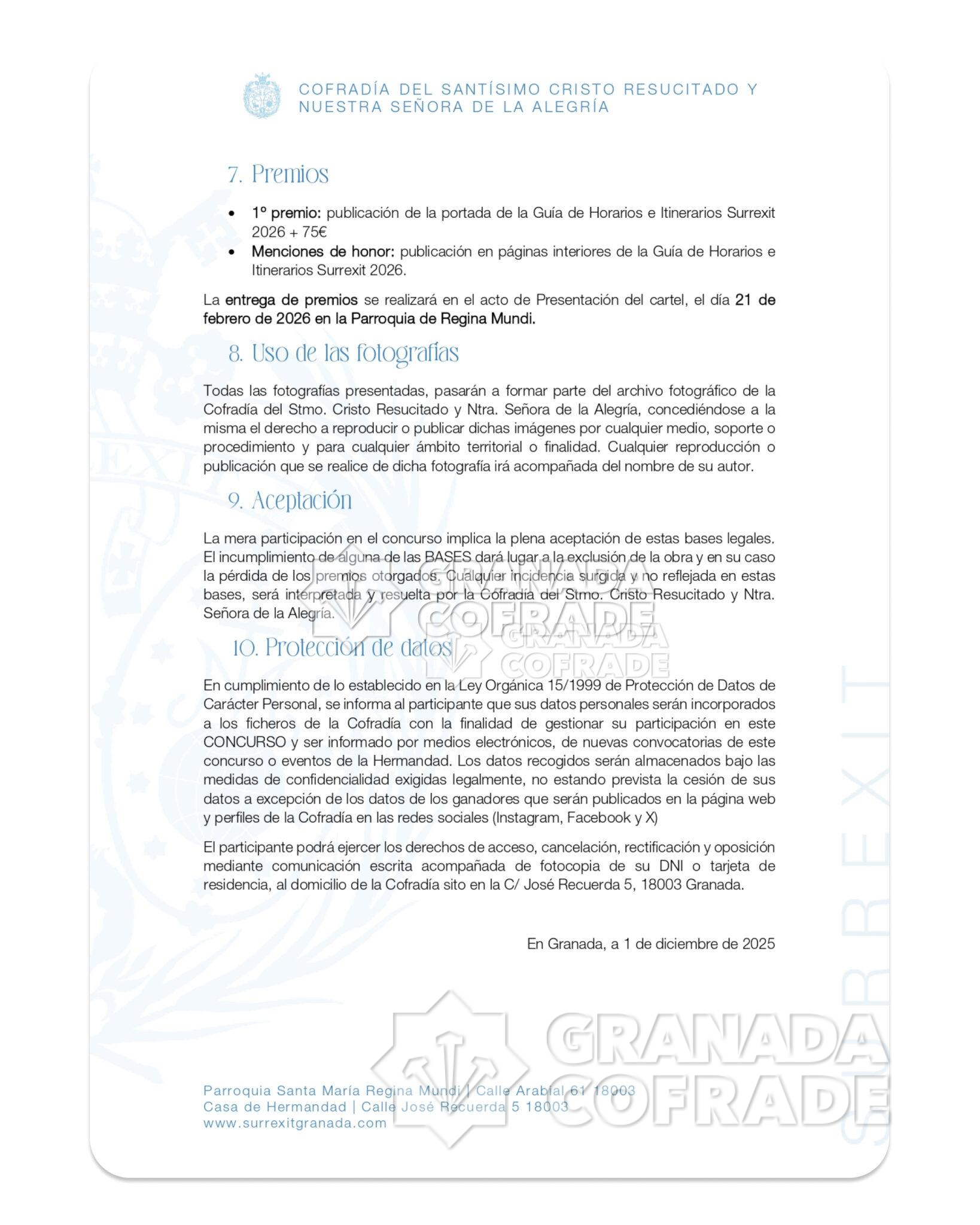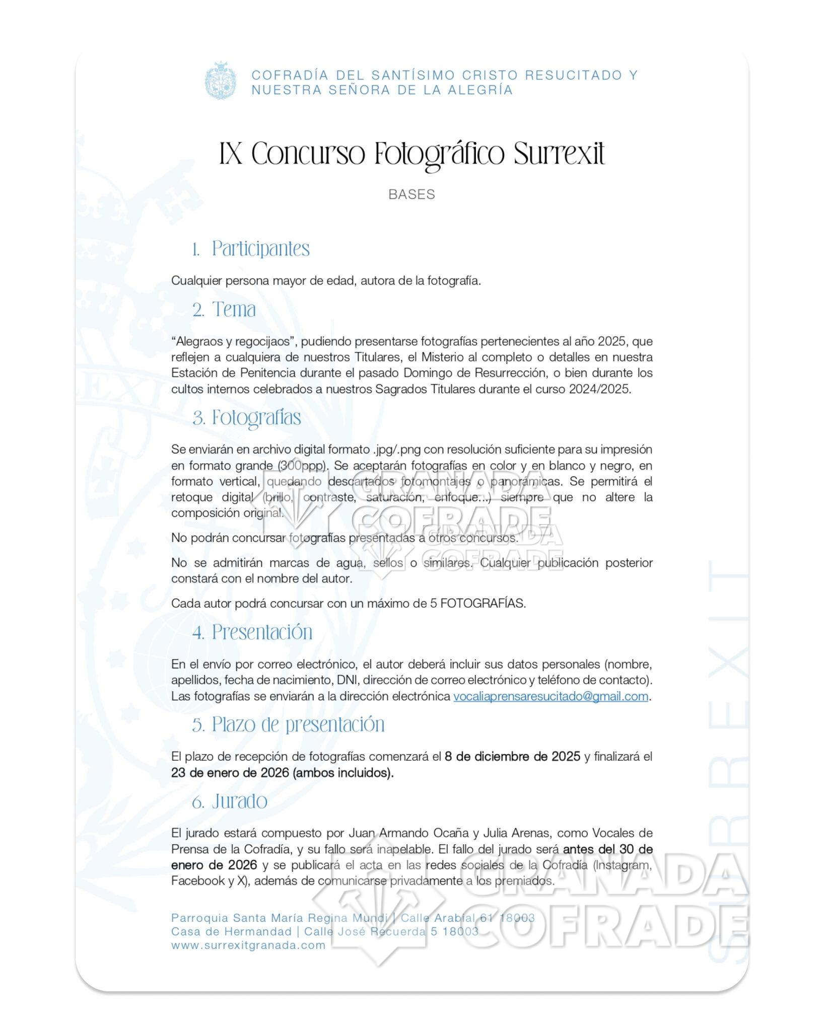 Con esta iniciativa, la Hermandad del Resucitado continúa apostando por la creatividad, la difusión de su patrimonio y la implicación de los fotógrafos en la vida cofrade, invitando a captar, a través del objetivo, la esencia de la alegría y el júbilo que caracterizan a la corporación.