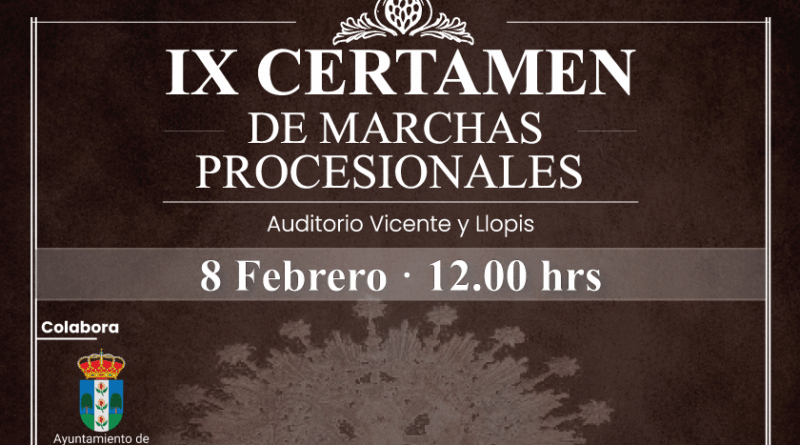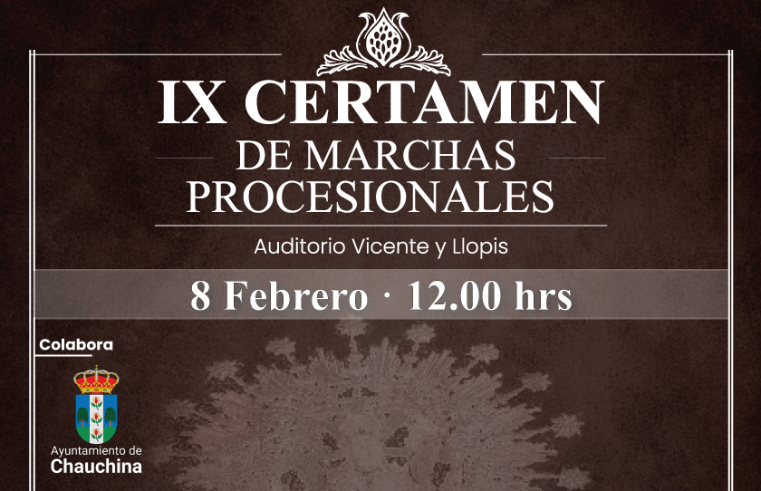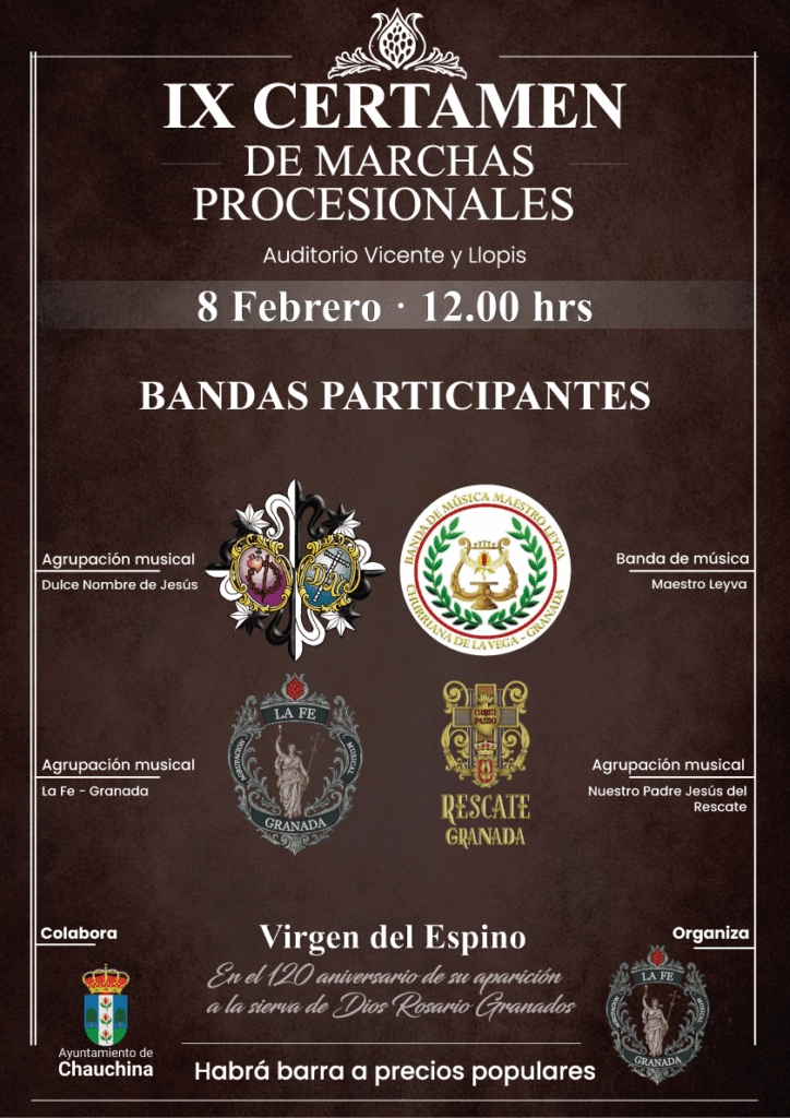 La localidad de Chauchina celebrará el próximo sábado 8 de febrero, a partir de las 12:00 horas, el IX Certamen de Marchas Procesionales, que tendrá lugar en el Auditorio Vicente y Llopis. El evento, organizado por la Agrupación Musical La Fe, contará con la presentación de Alfonso Arias Navarro y se enmarca dentro de los actos conmemorativos del 120 aniversario de la aparición de la Virgen del Espino a la sierva de Dios Rosario Granados.