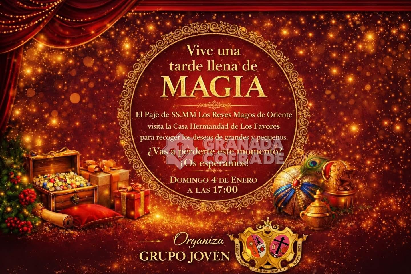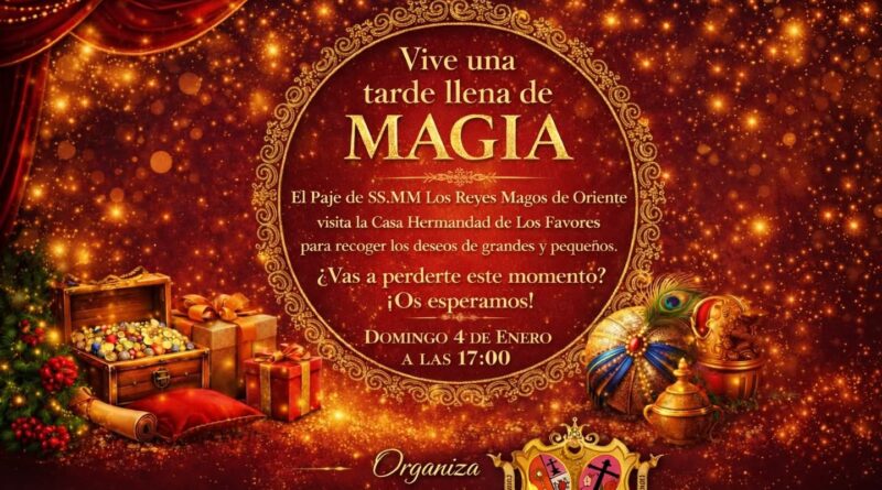 El Paje Real de los Reyes Magos de Oriente llegará a la casa de hermandad de la cofradía del Santísimo Cristo de los Favores hoy domingo, día 4 de enero, a las cinco de la tarde. La junta de gobierno y su hermano mayor en funciones, Norberto Navarro, quieren que sea esta una visita muy especial para disfrutarla en familia, llena de ilusión y con espíritu navideño y desean «que nadie se la pierda».