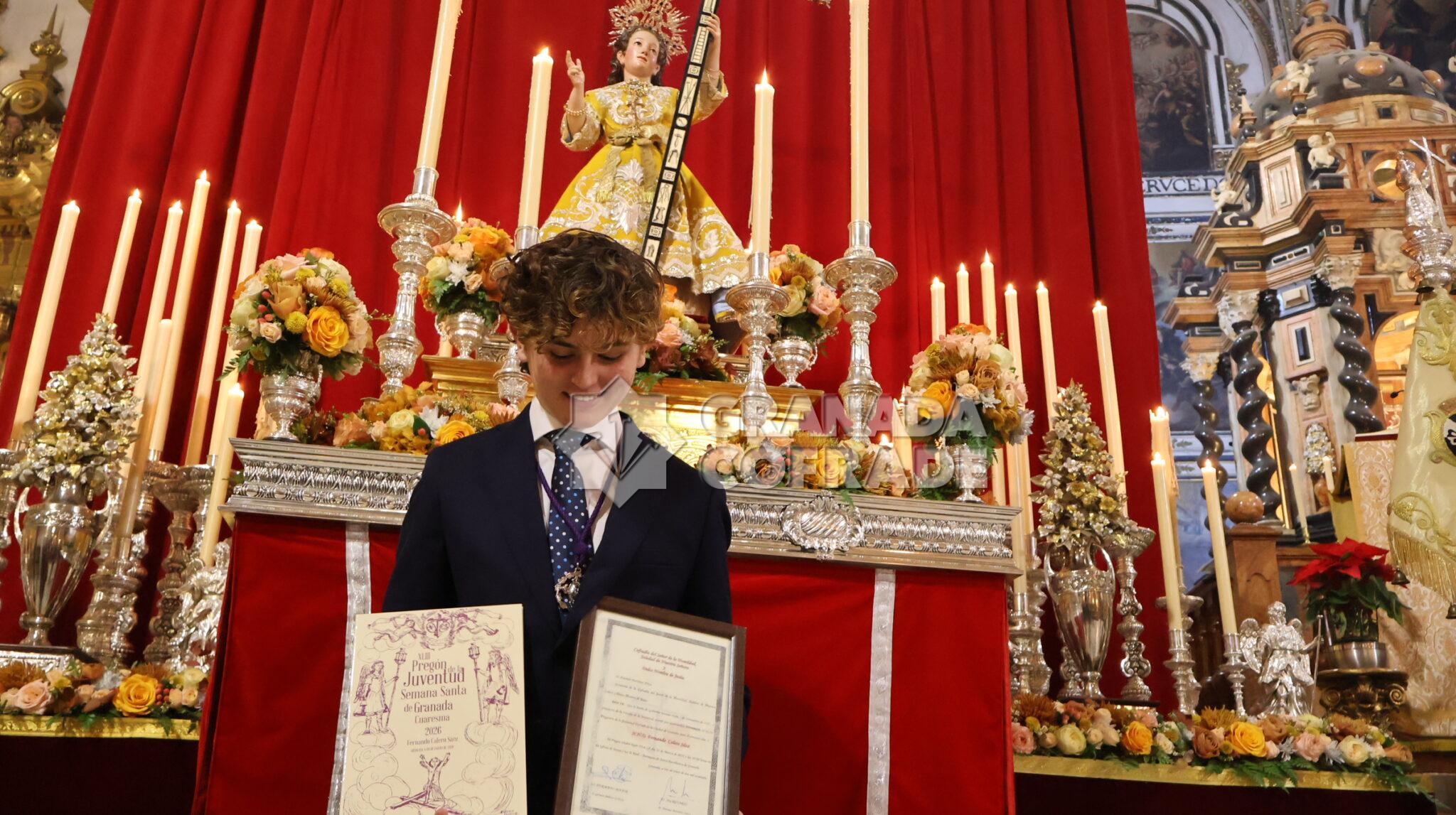 «Estoy muy agradecido a mi hermandad del Señor de la Humildad y a la vocalía de juventud por haber confiado en mí y por darme esta oportunidad para que muestre mis sentimientos y mi manera de ver la Semana Santa», refirió anoche el pregonero de la Juventud de la Semana Santa de Granada, Fernando Calero Sáez, después de recibir el acta de nombramiento y las tapas de encuadernación para su pregón que alcanza ya la cuadragésimo tercera edición. «Espero estar a la altura y ya os cuento que van saliendo cosas y tengo adelantado el pregón», indicó. A nuestra redacción señaló que quiero «que sea un pregón diferente a pesar de que después de cuarenta y tres años es difícil decir cosas innovadoras, pero lo intentaré».