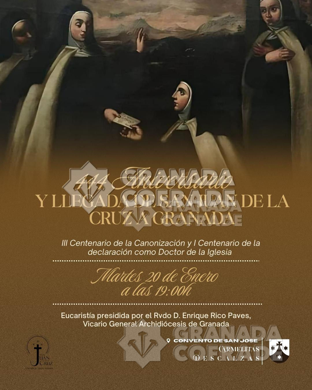 .- Eucaristía del 444 aniversario de la fundación del convento de Carmelitas Descalzas de Granada. Se conmemora la llegada a nuestra ciudad de las primeras monjas de la reforma de Santa Teresa, les acompañaba San Juan de la Cruz que también entró en Granada por primera vez. 19.00 horas, Convento de San José, de Carmelitas Descalzas. Preside Enrique Rico Pavés, Vicario General de la Archidiócesis de Granada.