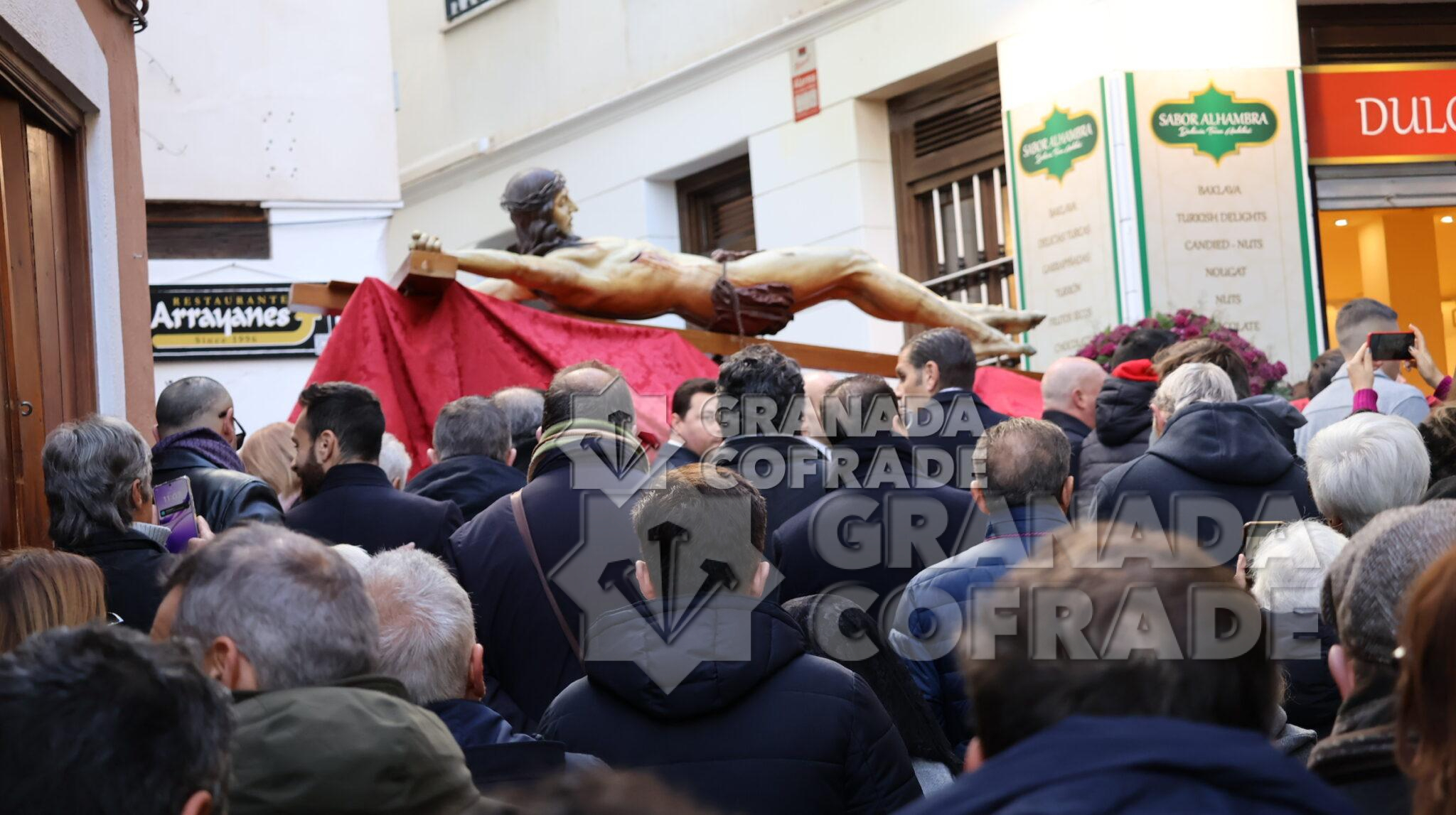En el cortejo participaba la presidencia con la hermana mayor y el acompañamiento del hermano mayor de la cofradía del Santo Cristo de San Agustín, Miguel Luis López-Guadalupe. Marchaba el Crucificado sobre sus andas de traslado y portado por su cuadrilla de costaleros a las órdenes de Curro Jimenez-Herrera y detrás del mismo se fue añadiendo cada vez mayor número de devotos que lo llevaron hasta su sede donde entraba a las once y cuarto para celebrar a continuación la Eucaristía del mes y después de habernos ofrecido espectaculares imágenes de devoción y oración ante el Crucificado.