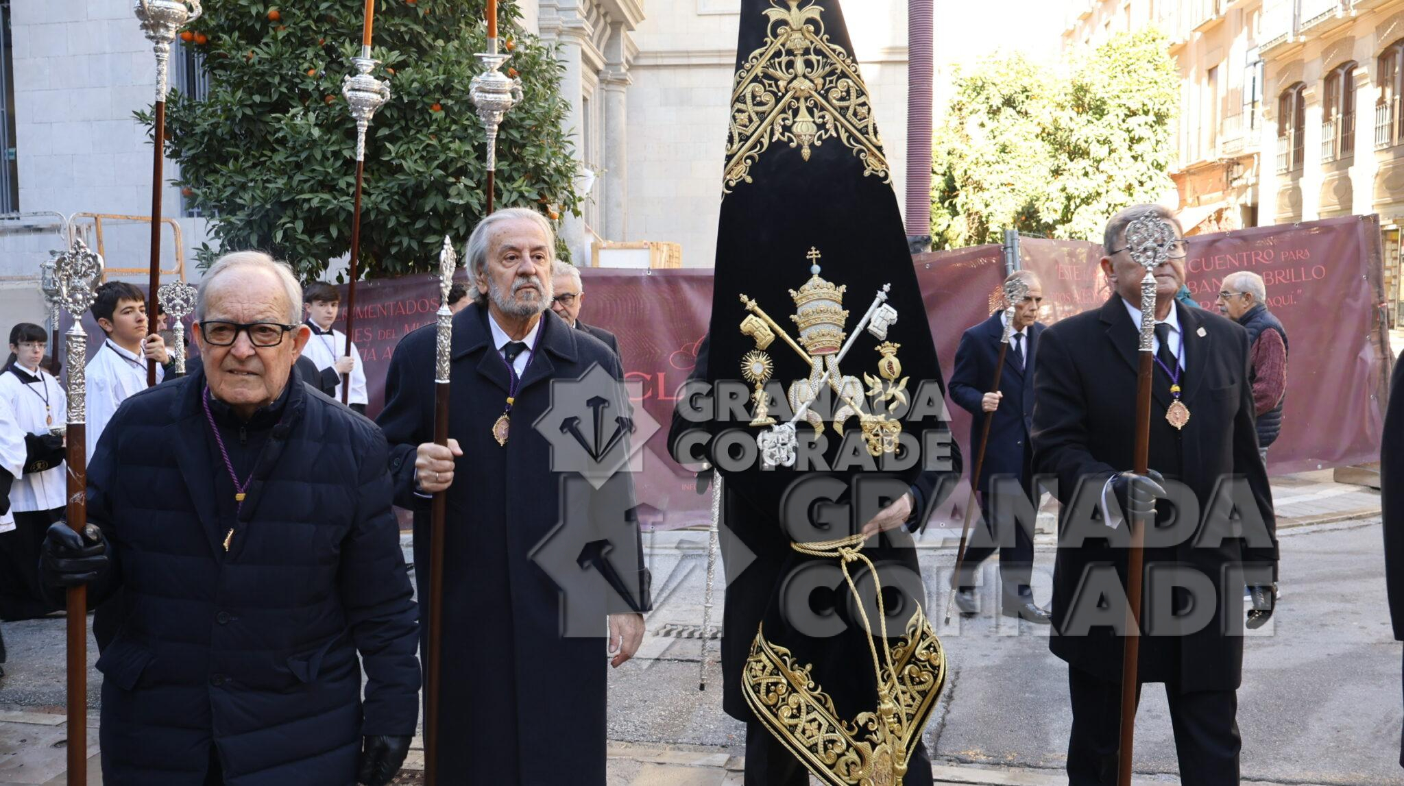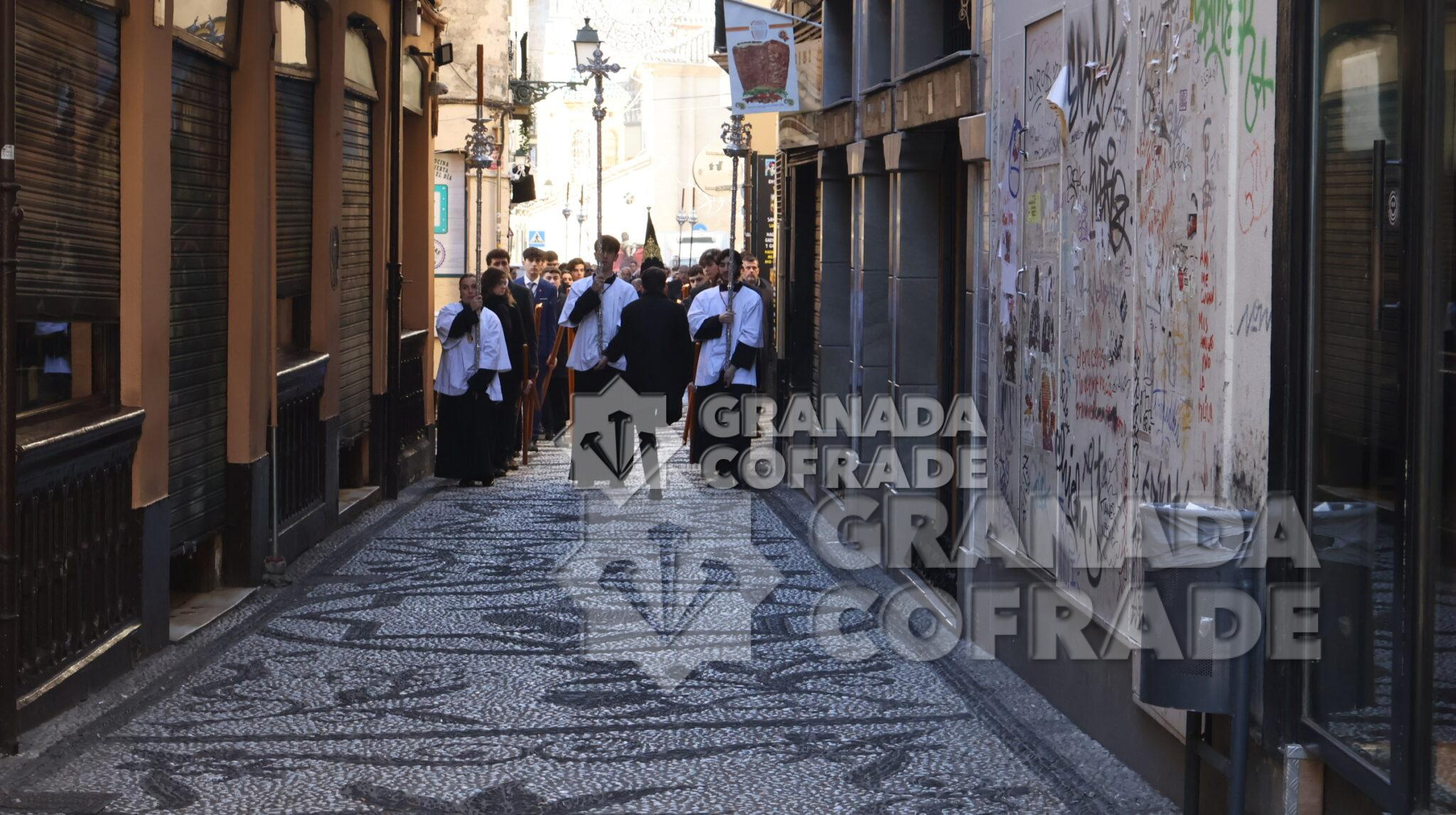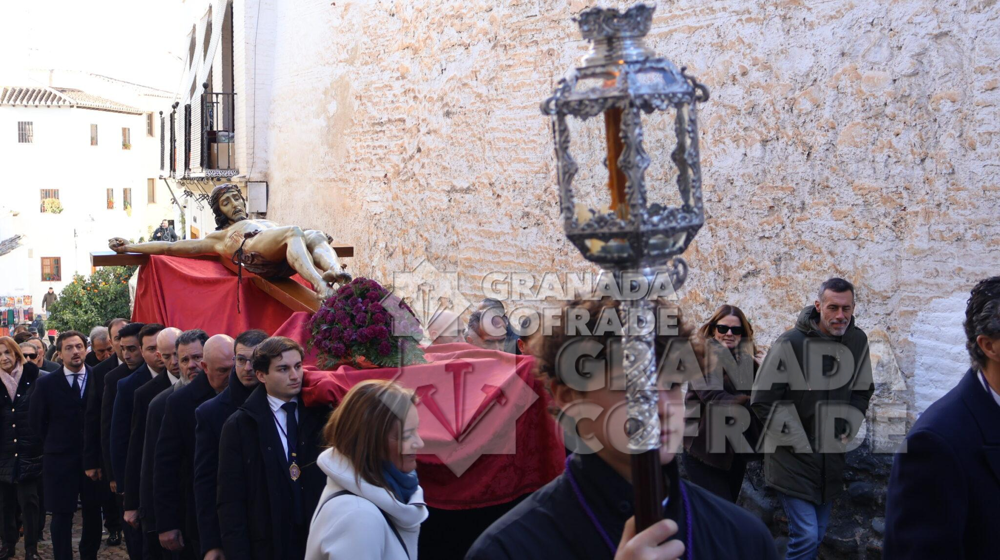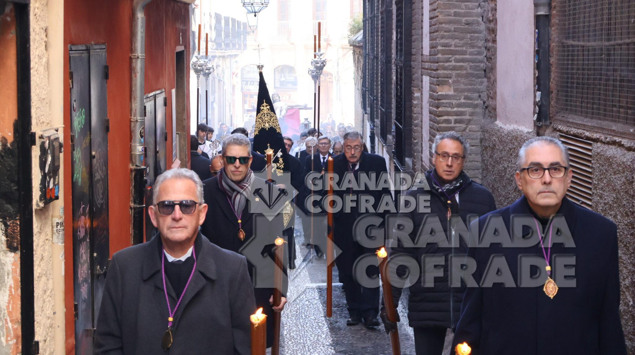 La imagen del Crucificado de la Misericordia, vulgo El Silencio, regresó envuelta en el clásico recogimiento y silencio que siempre rodea a esta imagen cuando se hace a las calles de Granada. El motivo, el final del Año Jubilar Peregrinos de Esperanza que se ha venido celebrando en la Catedral durante todo 2025 y su presencia en el presbiterio de la Seo granadina. En el interior de la Catedral queda aún la imagen original de José de Mora «que regresara por medios mecánicos y trasladado por la empresa que ha diseñado la muestra «José de Mora: la espiritualidad del Barroco», como indicó la hermana mayor de esta cofradía a nuestra redacción. Dieciocho parejas de hermanos formaban en el cortejo procesional que discurrió de manera ágil por calle Cárcel Baja, Pasaje Diego de Siloé, Gran Vía, Almireceros y siguió para subir a su barrio por la calle Calderería Vieja, Calderería Nueva y Cuesta de San Gregorio hasta los Grifos de San José y por la placeta de San José a su sede parroquial.