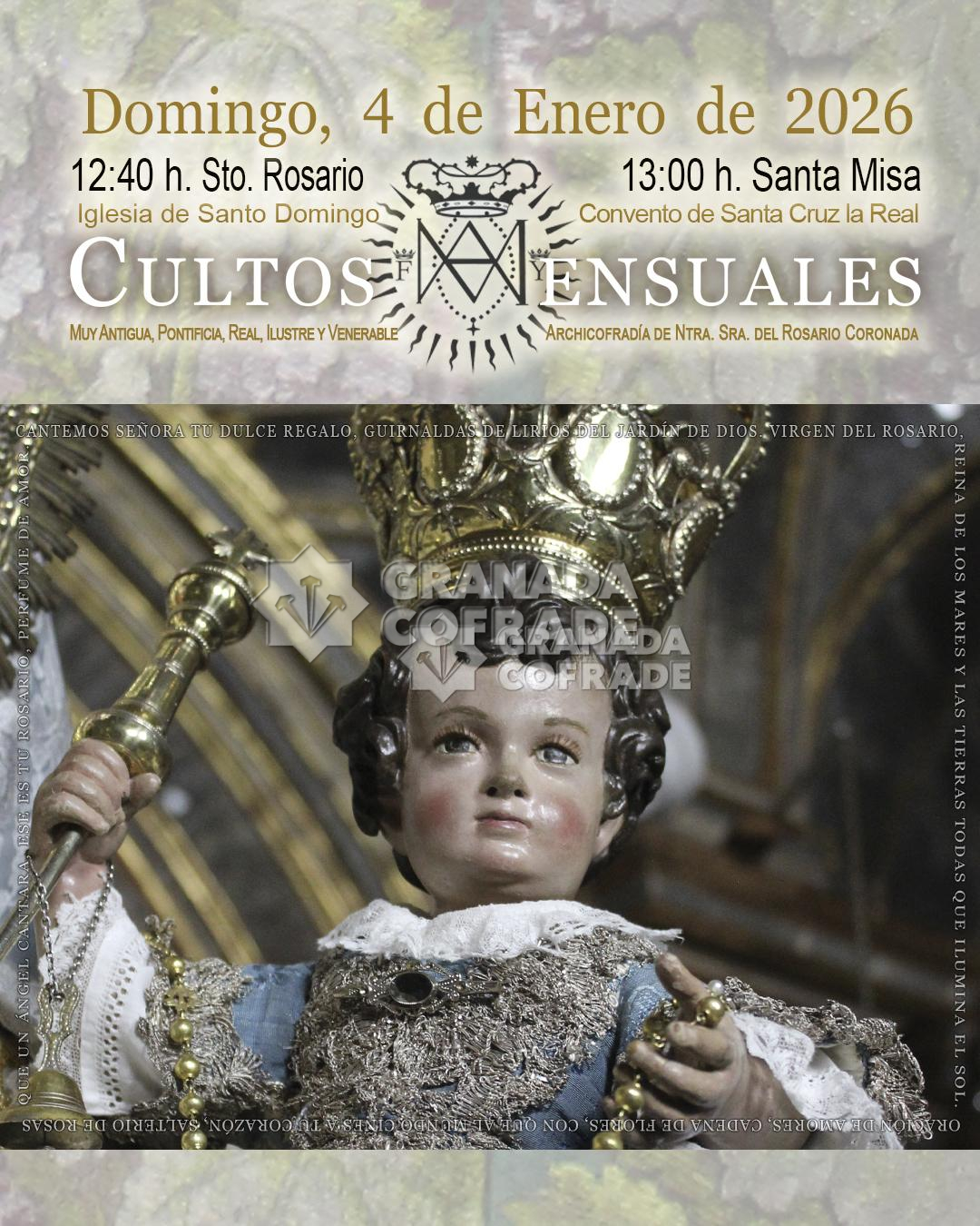 El próximo domingo día 4, primero del mes de enero, se celebrarán los cultos del primer domingo del mes de la Archicofradía de Nuestra Señora del Rosario, dedicados, como es inmemorial tradición de la Orden de Predicadores a Nuestra Señora, la Santísima Virgen del Rosario Coronada. Celebrará Fray Antonio Larios Ramos, O.P., Prior del Convento de Santa Cruz la Real y Director espiritual de nuestra Archicofradía, comenzando a las 12:40 horas con el rezo del Santo Rosario, y la Santa Misa a las 13:00 horas. La parte musical estará a cargo del Coro de la Parroquia del Rosario de Escúzar, que interpretará cantos litúrgicos y villancicos propios del tiempo de Navidad.