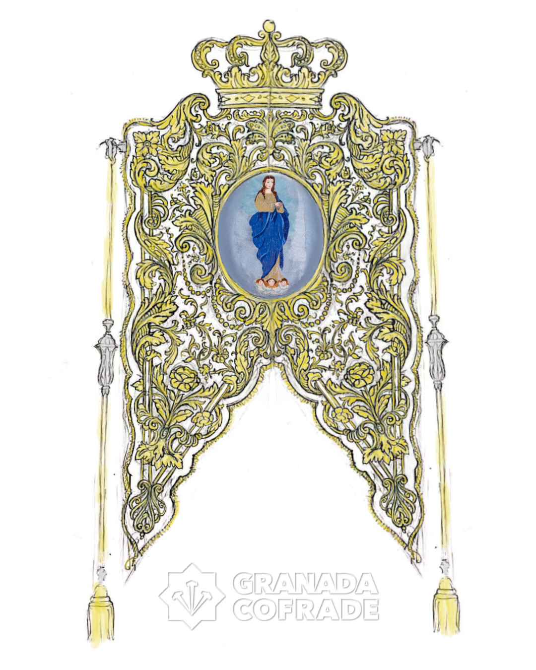 El diseño del Simpecado se inspira en la saya del “cuerno de la abundancia”, obra realizada por este mismo taller. El conjunto irá bordado en oro fino sobre soporte de lamé de plata, utilizando el restante de tejido empleado en la saya, que se rematará con borlas de oro. El Simpecado fue una donación de la familia Bertos Herrera a la hermandas, con asta de Miguel Moreno y fue bordado por Francisco García y Poo, de Sevilla, junto al óvalo de la maestra de bordado de Granada, Trinidad Morcillo, de nuestra ciudad. Se estrenó en el año 1994.