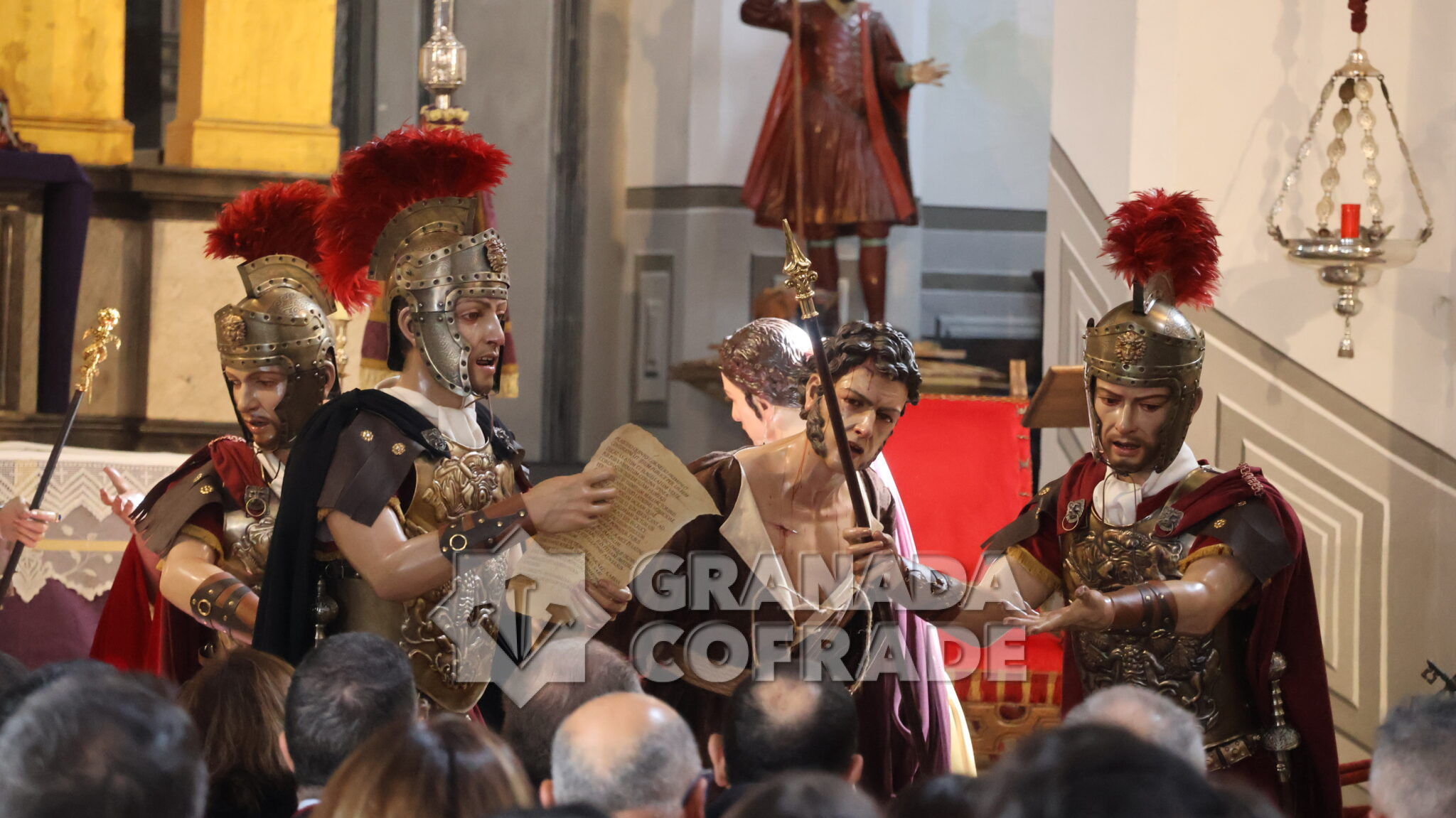 Son siete la figuras que se presentan en tres escenas «bien diferenciadas. La primera son los dos soldados romanos que presenta uno a Jesús ante el pueblo y otro lee la sentencia de muerte en la cruz. La segunda, otro soldado va a dar libertad al delincuente Barrabás y una tercera, en las espaldas del paso, el pretor Poncio Pilatos asiste a la conversación con Claudia Prócula que le pide que no se cumpla la sentencia mientras Caifás convence al pretor para la ejecución de Cristo. Un lacayo negro ofrece la palangana para lavarse las manos. Todas las figuras están realizadas en cedro, la cabeza y manos, y el cuerpo en pino. Son «articuladas de las extremidades superiores, para facilitar las vestimentas», según refirió.