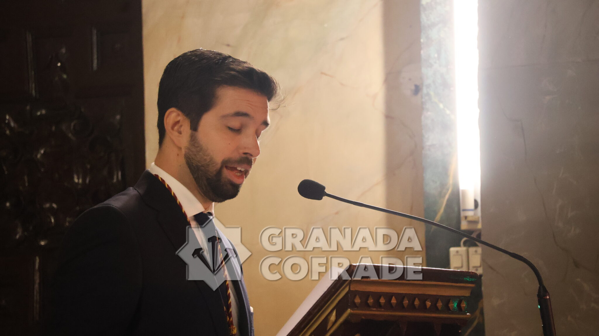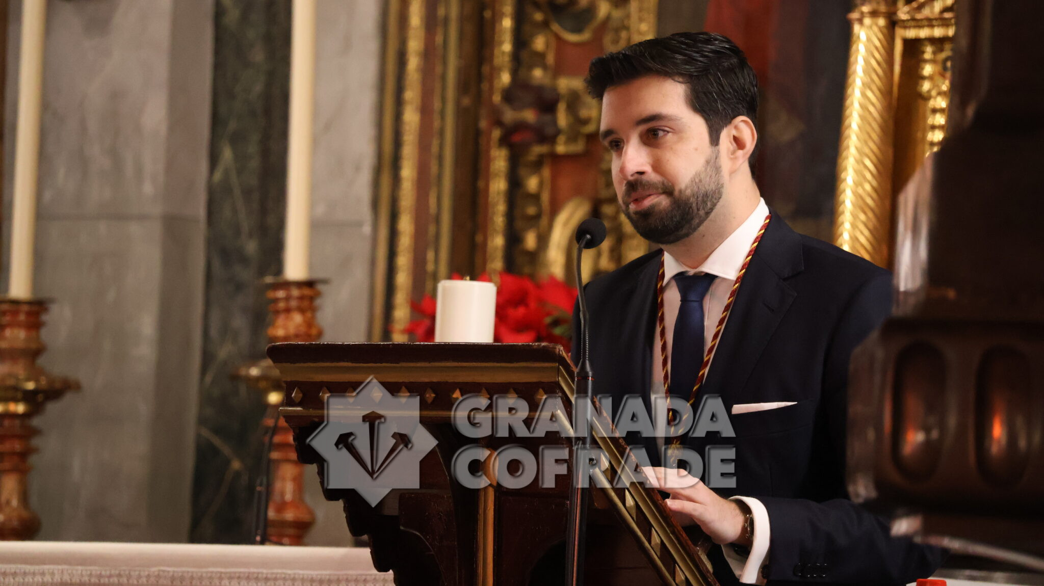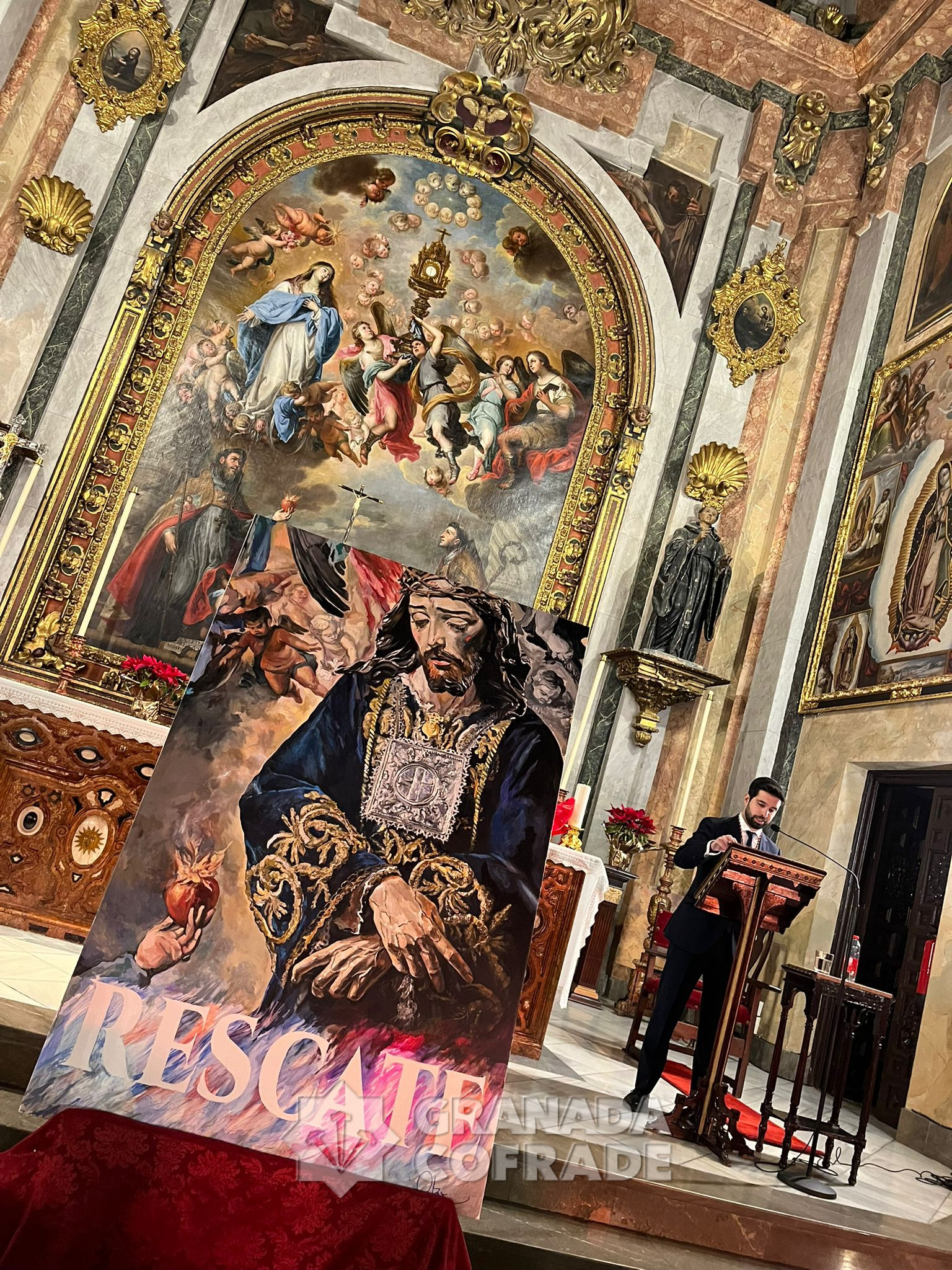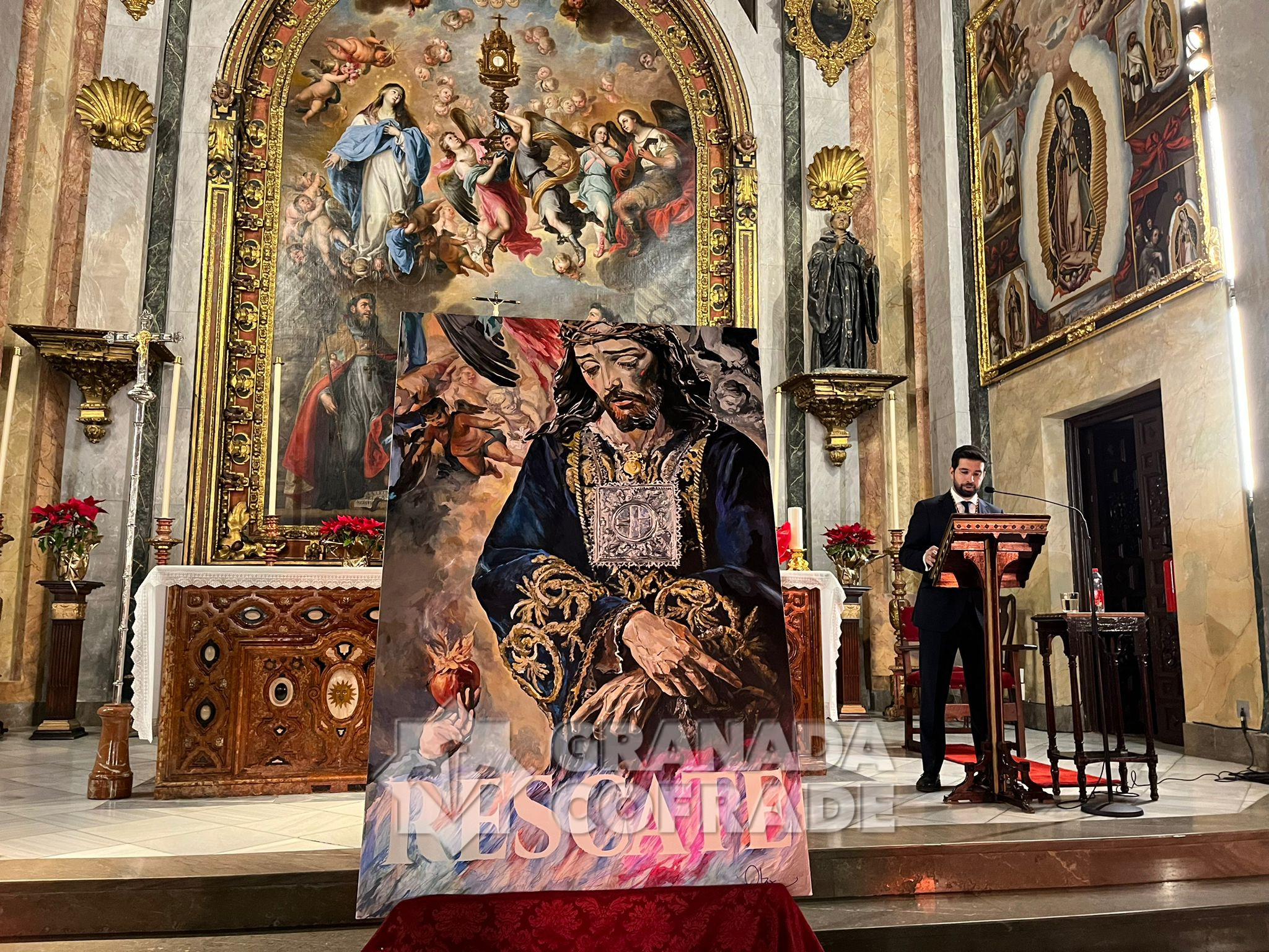 «Tenía varias ideas y lo que he pretendido es reflejar el continuo, en el que he tratado de conjugar las dos obras cumbres del barroco granadino, la imagen del Señor de Granada, de Diego de Mora y la Exaltación de la Eucaristía de San Agustín y Santo Tomás de Villanueva, que preside el altar mayor de la Magdalena, obra de Juan de Sevilla, de 1685», confesó a nuestra redacción el autor del cartel que anuncia el besamanos multitudinario del primer viernes de marzo que será este año el día 6, como es costumbre desde hace ya más de setenta y cinco años. Ayer fue descubierto el cuadro pintado por el granadino Manuel Obregón.
