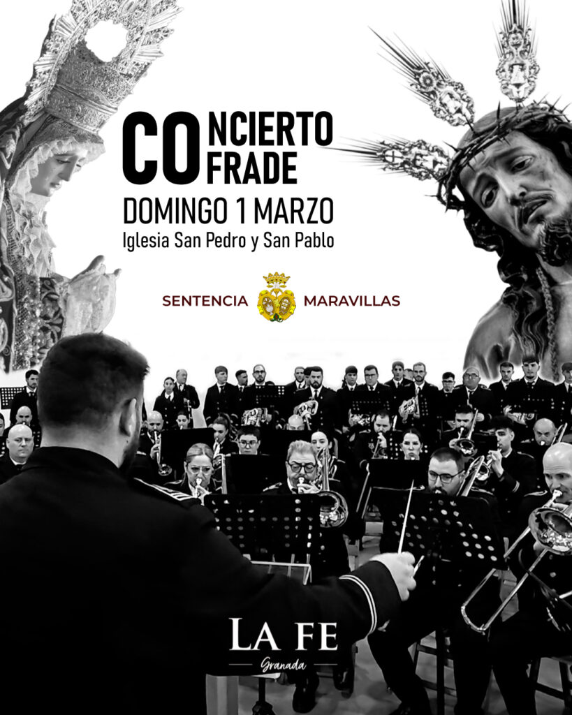 La Agrupación Musical La Fe celebrará el próximo domingo 1 de marzo un concierto en la Iglesia de San Pedro y San Pablo de Granada, tras la Eucaristía dominical de la mañana. Este concierto alcanza su tercera edición consecutiva junto a la Hermandad de Sentencia y Maravillas, consolidándose como una cita destacada dentro del calendario musical previo a la Semana Santa. Desde estas líneas, la Agrupación Musical La Fe «desea agradecer públicamente a la hermandad la confianza depositada en nosotros y el apoyo incondicional que nos brinda año tras año».