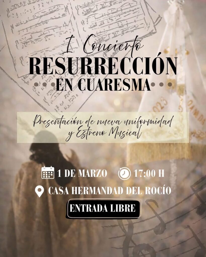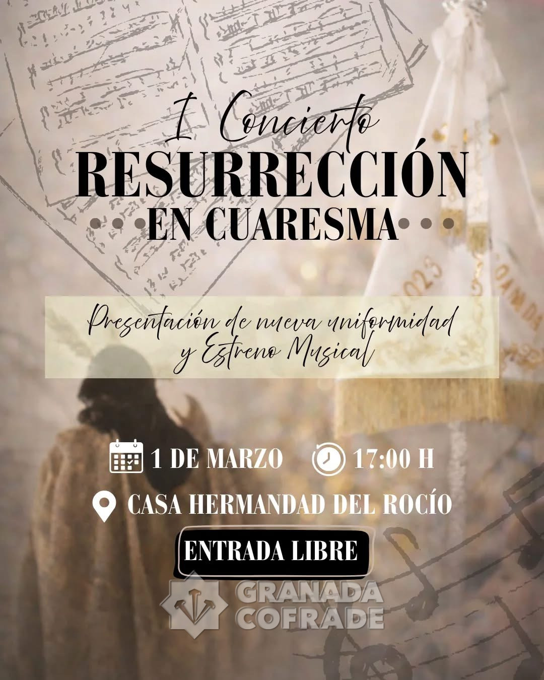 Convoca la cofradía del Señor de la Resurrección el concierto de cuaresma de esta corporación del barrio de Los Vergeles. Será mañana domingo, día primero de marzo, a las cinco de la tarde en la Casa de Hermandad del Rocío, en calle Tiburón, 7. Este concierto, concebido como un acto cultural y musical dentro del tiempo de Cuaresma, supondrá una ocasión muy especial para la formación. Durante el mismo se interpretarán diversas marchas que han sido recientemente incorporadas al repertorio, mostrando así la evolución y el trabajo desarrollado en los últimos meses.
