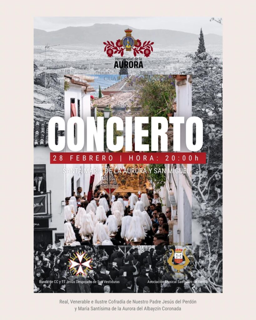 La Hermandad de la Aurora organiza un concierto de sus formaciones musicales, la Banda de Cornetas y Tambores de Jesús Despojado de Sus Vestiduras y la Asociación Musical San Isidro de Armilla, que se celebrará el próximo sábado, 28 de febrero, a las 20:00 horas, en la Iglesia de Santa María de la Aurora y San Miguel. «Este concierto pretende ser un encuentro de música cofrade como antesala de la próxima Estación de Penitencia, ofreciendo a hermanos y devotos la oportunidad de compartir un momento de recogimiento y preparación espiritual a través de la música procesional», indican a nuestra redacción desde la organización del evento.