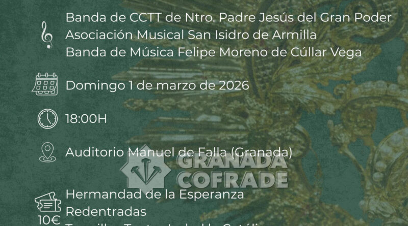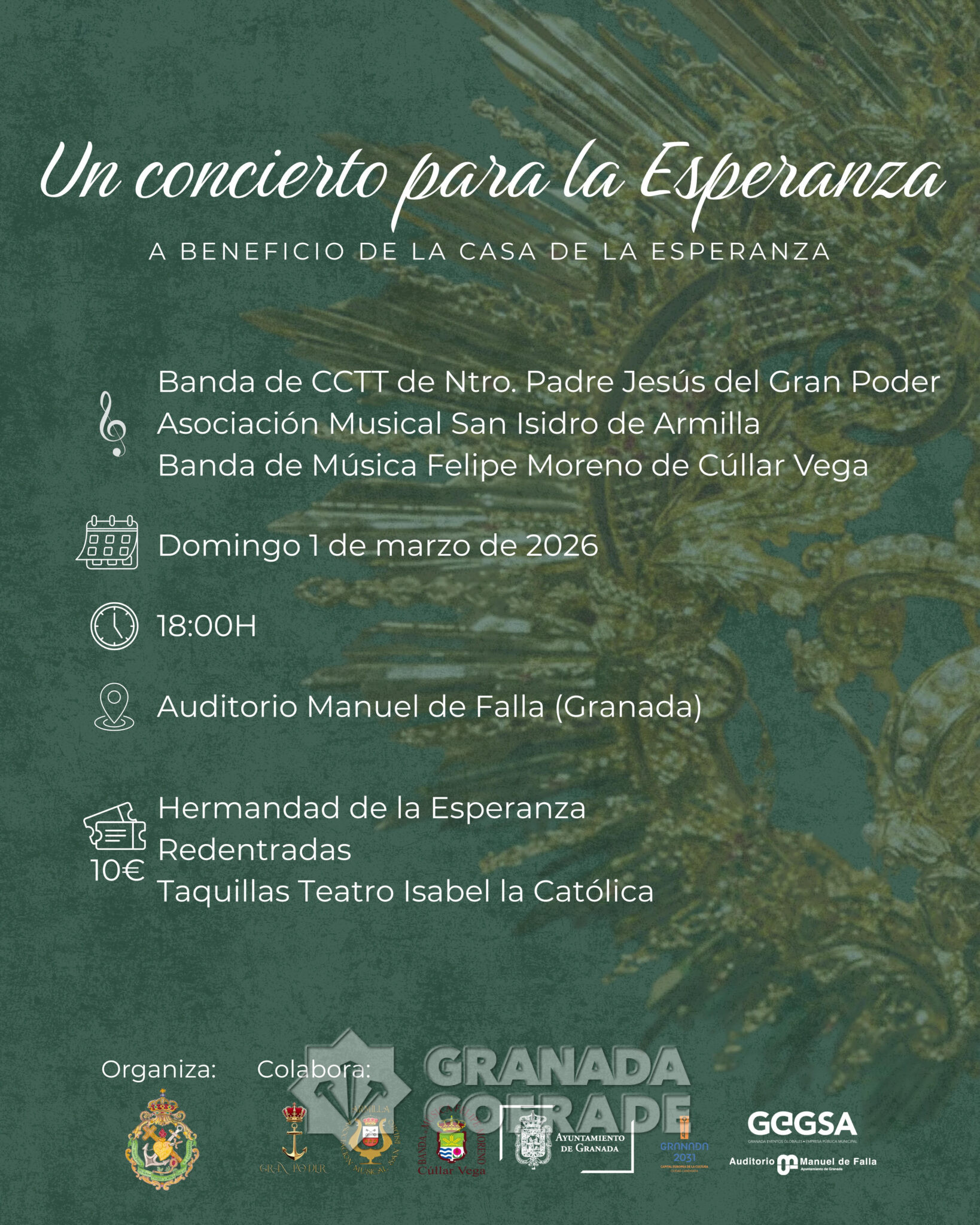 A beneficio de la Casa de la Esperanza, que sostiene la hermandad de Jesús del Gran Poder y Nuestra Señora de la Esperanza, con la ayuda de la Fundación Amaranta, se ha organizado un concierto de marchas procesionales bajo el título «Un concierto para la Esperanza». En la misma participará la banda de cornetas y tambores de Jesús del Gran Poder, la Asociación musical «San Isidro», de Armilla y de Cúllar Vega, la Asociación «Felipe Moreno».