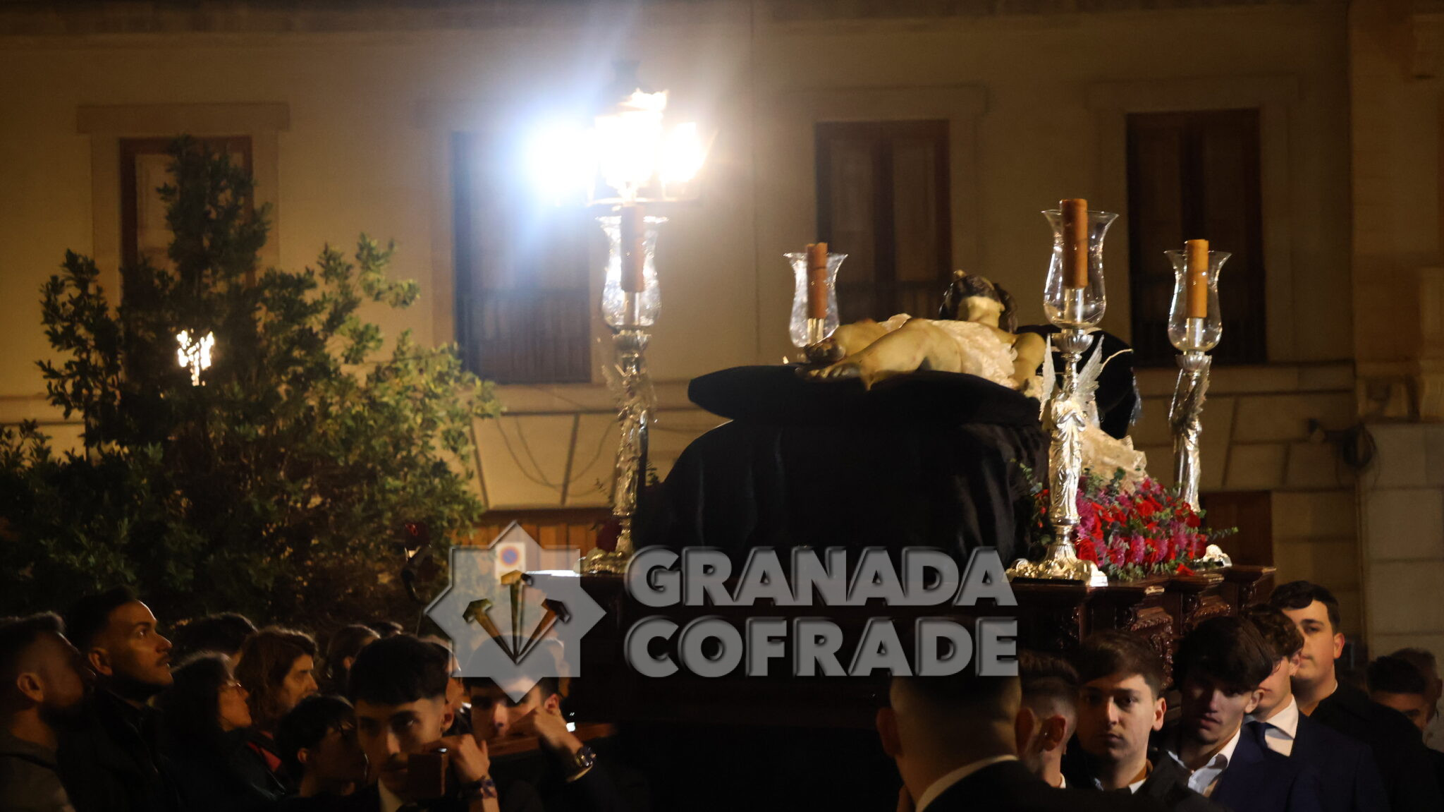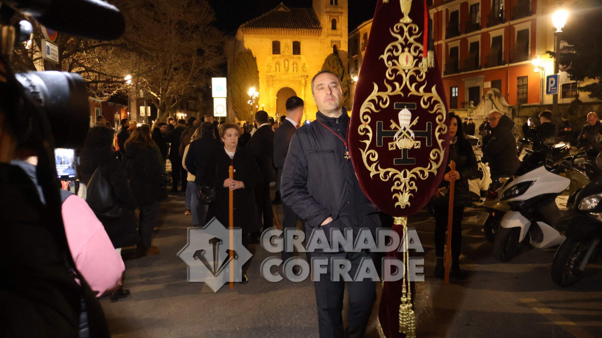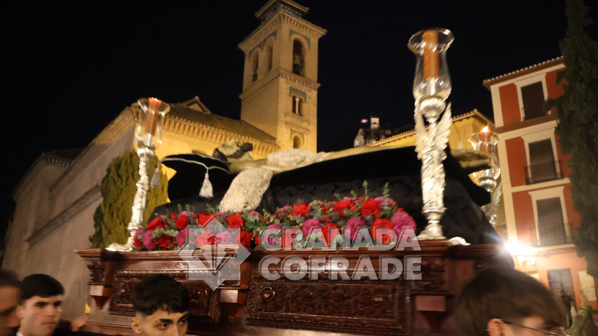 Integraban el cortejo la cruz alzada y nueve parejas de hermanos, continuando con la presidencia del hermano mayor, Álvaro Esteban, y el consiliario de la hermanad, José Gabriel Martín, que dirigió el rezo de las catorce estaciones, realizando la primera de ellas en el interior de San Gil y Santa Ana. La música la puso el trio «Granamusic» y era portada la imagen por miembros de su cuadrilla de costaleros, situada sobre túmulo de madera y custodiado por candeleros con cera. El cortejo lo cerraban miembros del Cuerpo de Caballeros del Santo Sepulcro, con sus habituales capas.