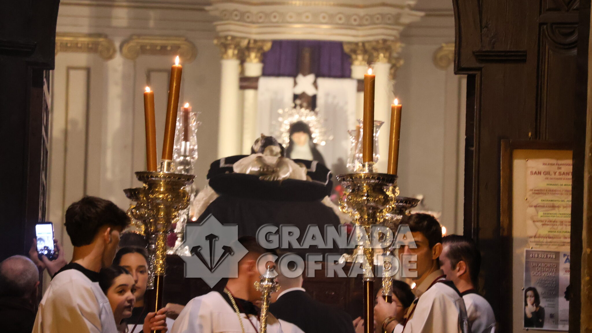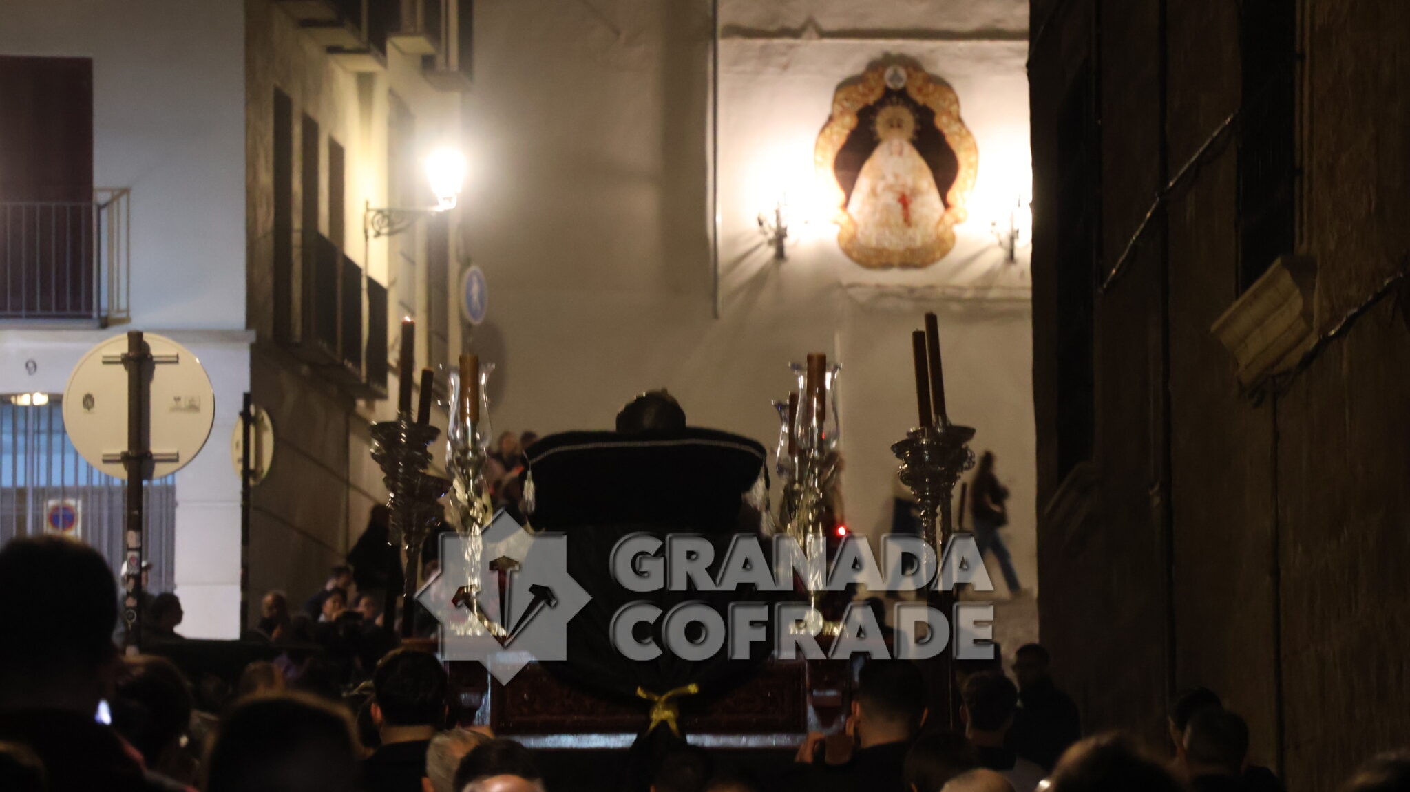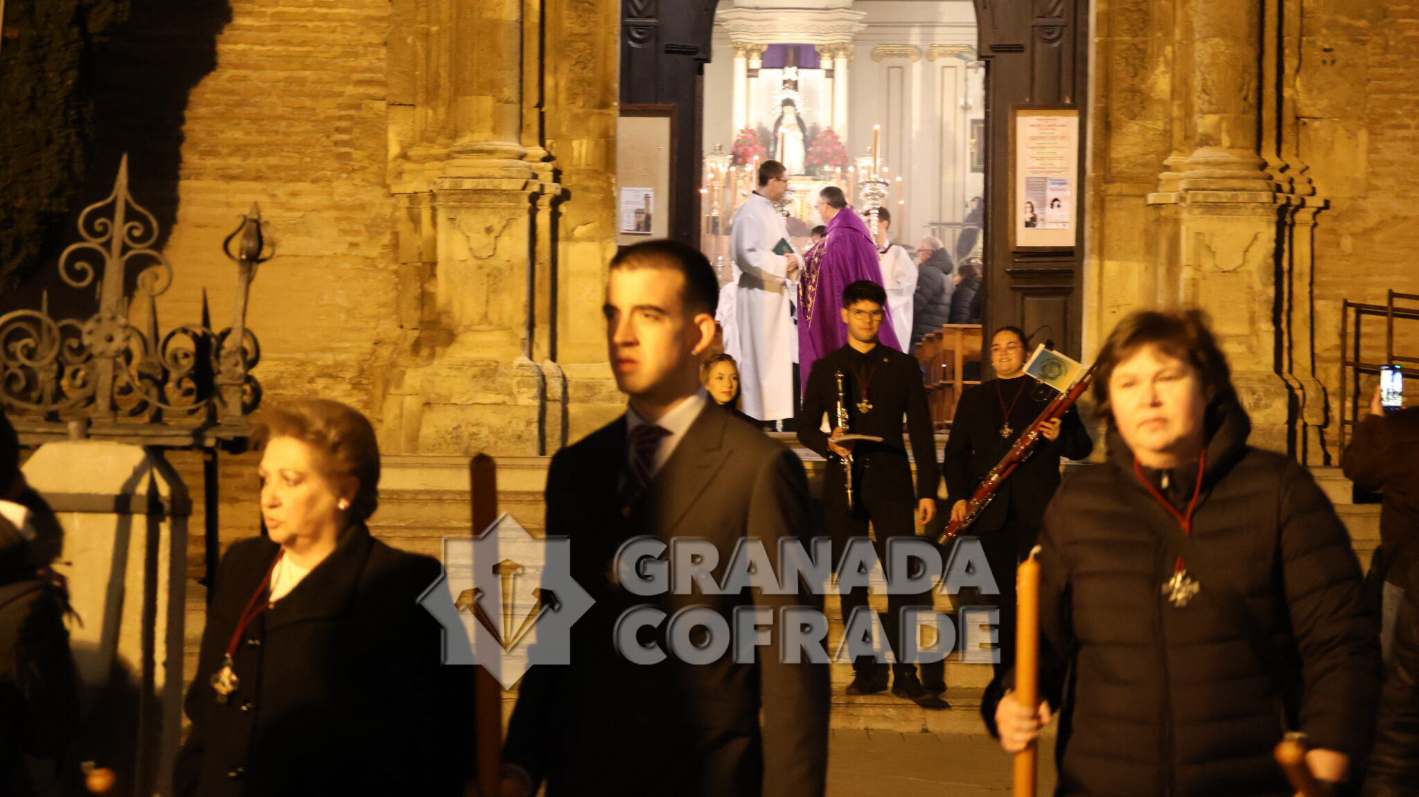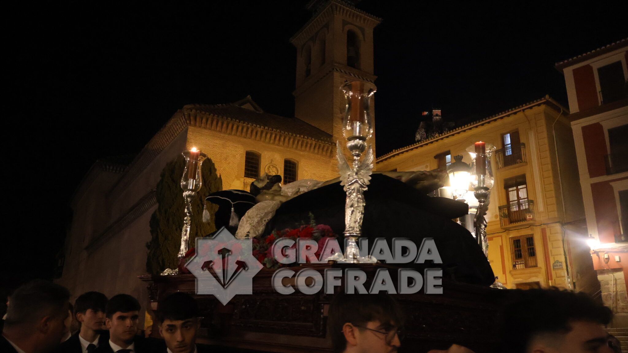 Integraban el cortejo la cruz alzada y nueve parejas de hermanos, continuando con la presidencia del hermano mayor, Álvaro Esteban, y el consiliario de la hermanad, José Gabriel Martín, que dirigió el rezo de las catorce estaciones, realizando la primera de ellas en el interior de San Gil y Santa Ana. La música la puso el trio «Granamusic» y era portada la imagen por miembros de su cuadrilla de costaleros, situada sobre túmulo de madera y custodiado por candeleros con cera. El cortejo lo cerraban miembros del Cuerpo de Caballeros del Santo Sepulcro, con sus habituales capas.