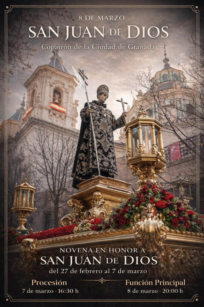 Comienza hoy viernes, 27 de febrero, la Solemne Novena en honor de San Juan de Dios, copatrón de Granada. Se prolongará hasta el 7 de marzo y el día 8 tendrá lugar la función solemne en su festividad litúrgica. Cada jornada dará comienzo a las siete y media de la tarde en la basílica de San Juan de Dios  y el día 7 está prevista la salida procesional de la imagen, obra de Bernardo Francisco de Mora, del siglo XVII. El recorrido procesional será partiendo de su sede, a las cuatro y media de la tarde para realizar el itinerario por la calle San Juan de Dios, Nueva del Santísimo, Santos, calle Azacayas, Gran Vía de Colón, calle de los Reyes Católicos, calle Mesones, plaza de la Trinidad, calle Capuchinas, Romanilla, San Jerónimo y regreso a la basilica por calle San Juan de Dios.