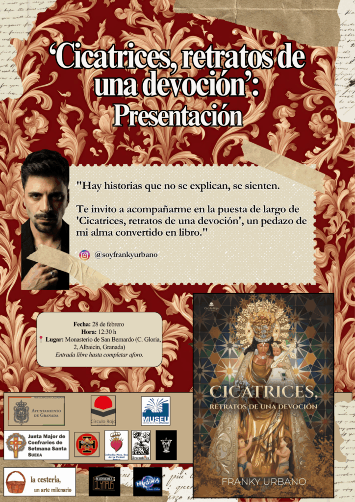 Francisco Jiménez Urbano (Franky Urbano) presenta el próximo sábado 28 de febrero, Día de Andalucía, su nueva obra «Cicatrices: retratos de una devoción». El acto tendrá lugar a las 12:30 h en el Monasterio de San Bernardo, situado en el emblemático Paseo de los Tristes, a los pies de la Alhambra. El libro nace con la firme vocación de que la riqueza y el trabajo diario de las hermandades de Granada sean proyectados y valorados en todo el territorio nacional.