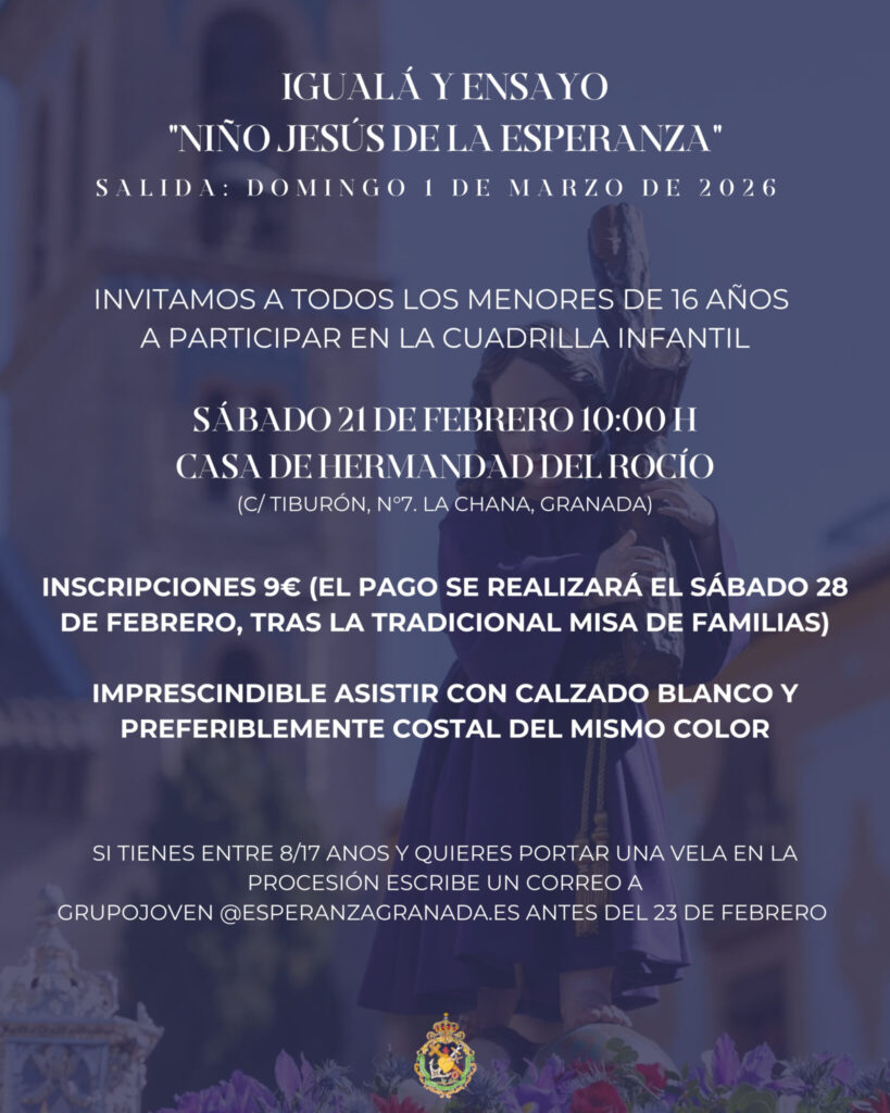 El domingo, 1 de marzo, será la salida procesional del Niño Jesús de la Esperanza, de la hermandad de Jesús del Gran Poder. Para ello se convoca a los menores de 16 años a participar en la cuadrilla infantil de esta hermandad del Martes Santo y a asistir a la «igualá» y ensayo que está convocado para el próximo sábado día 21 de febrero a las 10.00 de la mañana en la casa de hermandad del Rocío, en la calle Tiburón, 7 de La Chana.