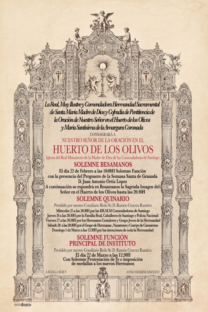 Convoca la cofradía de la Oración de Nuestro Señor en el Huerto de los Olivos el quinario en honor de sus Titulares. Darán comienzo los actos el domingo día 22 de febrero a las diez de la mañana con la recepción del pregonero de la Semana Santa de Granada de 2026, Juan Antonio Ortiz López y la función solemne que finalizará con el besamanos al Señor y que iniciará el propio pregonero en las Comendadoras de Santiago. Estará expuesto en besamanos durante toda la jornada y hasta las 20.30 horas.