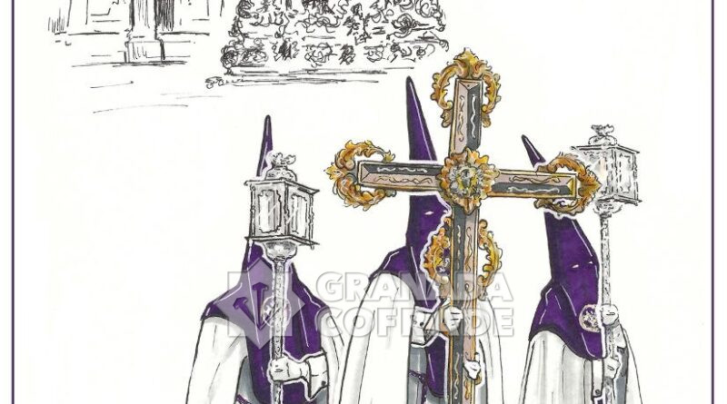 La Hermandad de las Tres Caídas ha presentado el proyecto iconográfico que acompañará a las papeletas de sitio de los próximos años, concebido como un recorrido visual y espiritual que se desarrollará entre 2026 y 2029. La primera de estas estampas, correspondiente al Miércoles Santo de 2026, ha sido realizada por la artista Estefanía Recio. En ella, la Cruz de Guía aparece en primer plano, acompañada por sus faroles, marcando el inicio de la Estación de Penitencia. Al fondo, de manera intencionadamente sugerida, se intuye el paso de Jesús de las Tres Caídas asomando a la puerta de la iglesia de Santo Domingo, recordando que toda estación comienza en la Cruz y se dirige hacia el Misterio del Señor.