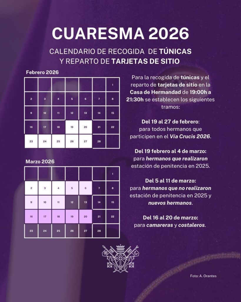 • Del 19 de febrero al 4 de marzo de 2026, de 19:00h a 21:30h: tarjetas de sitio y túnicas para hermanos que realizaron estación de penitencia el año 2025.