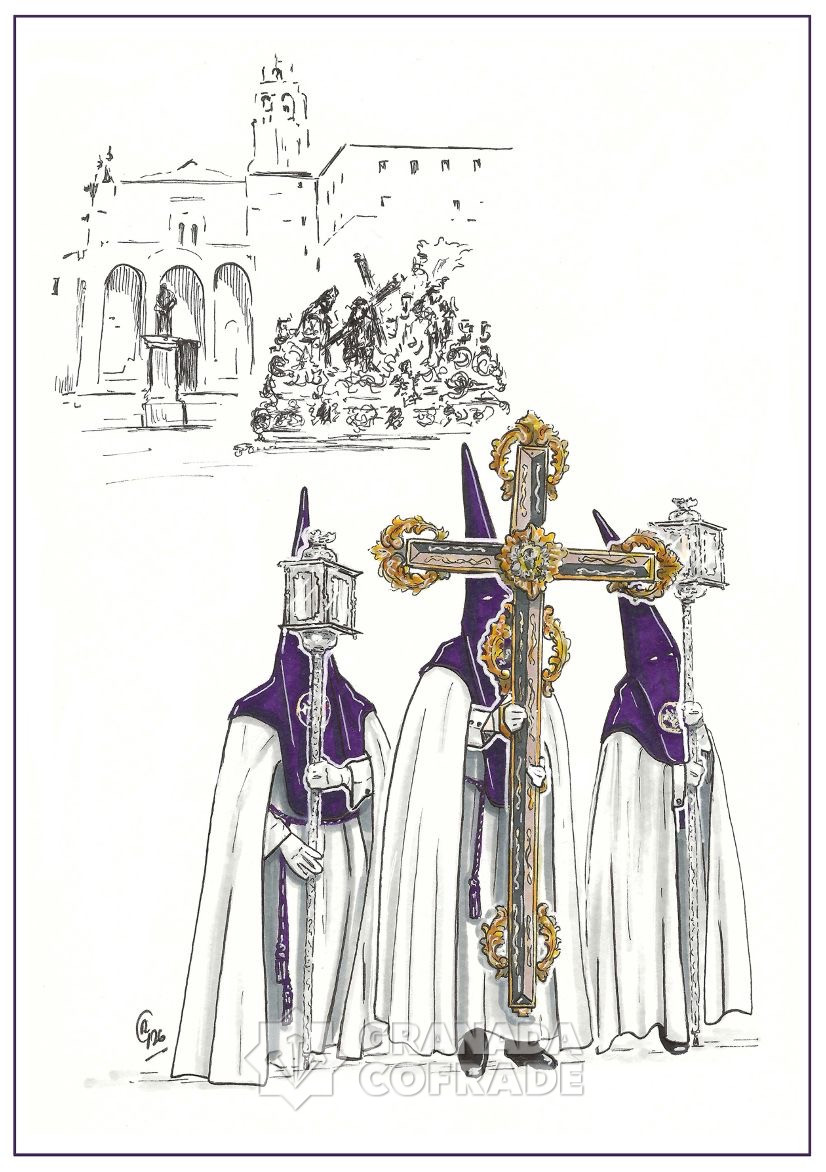 La Hermandad de las Tres Caídas ha presentado el proyecto iconográfico que acompañará a las papeletas de sitio de los próximos años, concebido como un recorrido visual y espiritual que se desarrollará entre 2026 y 2029. La primera de estas estampas, correspondiente al Miércoles Santo de 2026, ha sido realizada por la artista Estefanía Recio. En ella, la Cruz de Guía aparece en primer plano, acompañada por sus faroles, marcando el inicio de la Estación de Penitencia. Al fondo, de manera intencionadamente sugerida, se intuye el paso de Jesús de las Tres Caídas asomando a la puerta de la iglesia de Santo Domingo, recordando que toda estación comienza en la Cruz y se dirige hacia el Misterio del Señor.